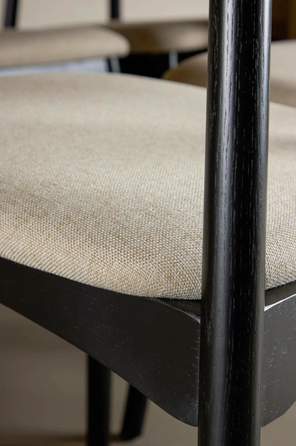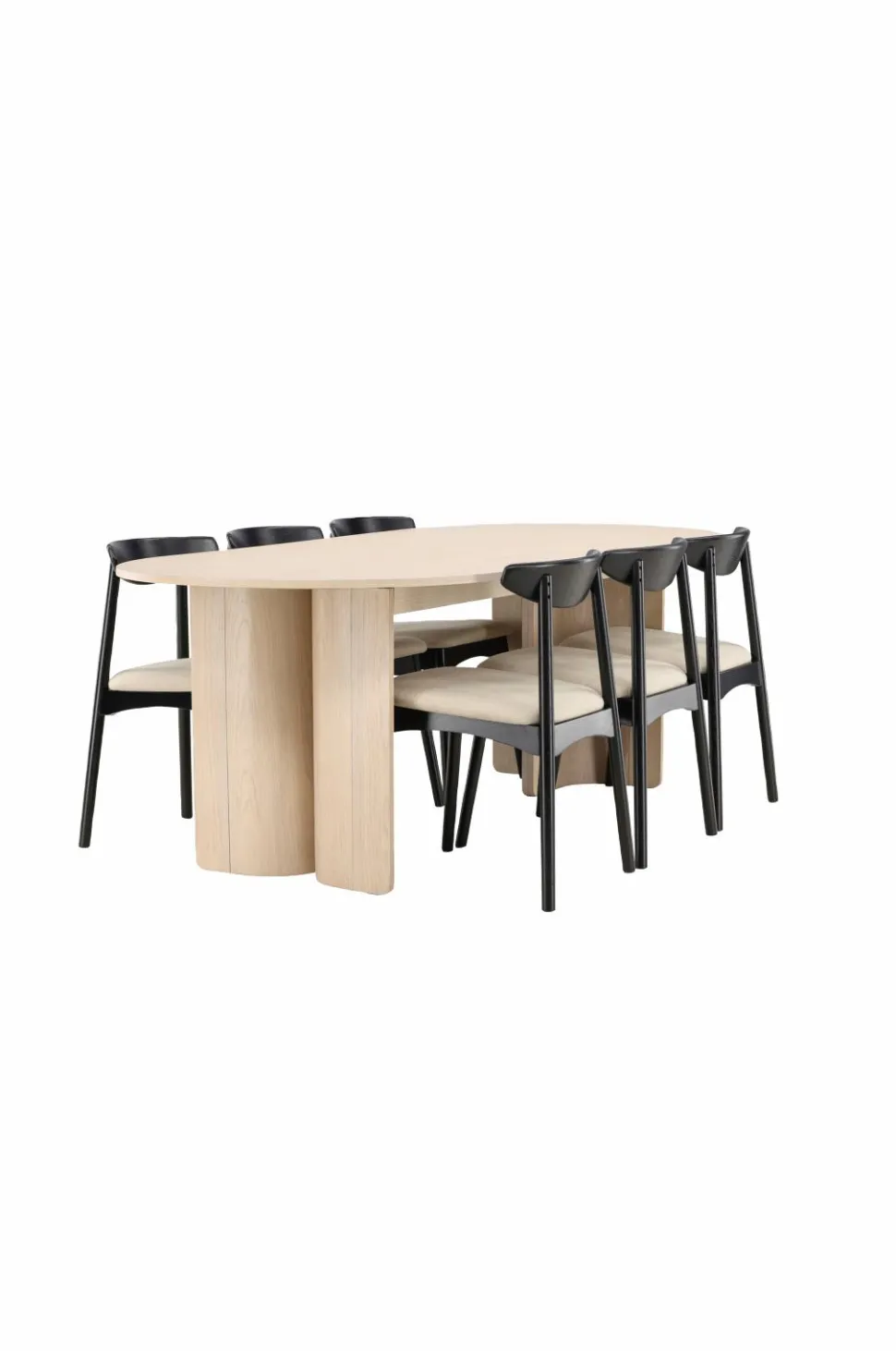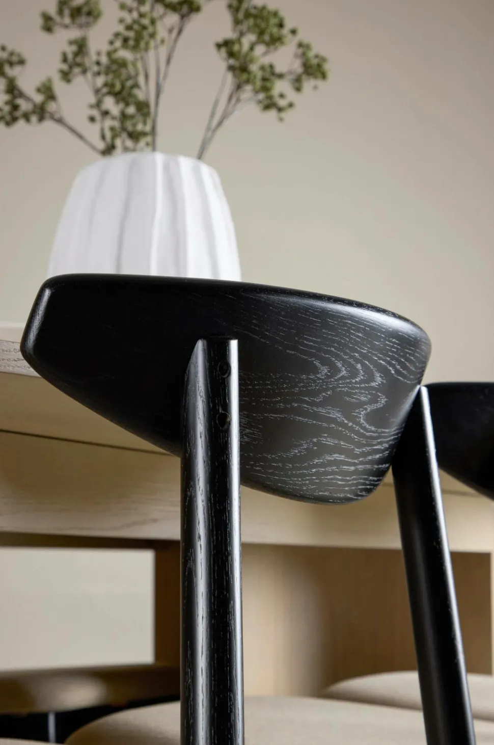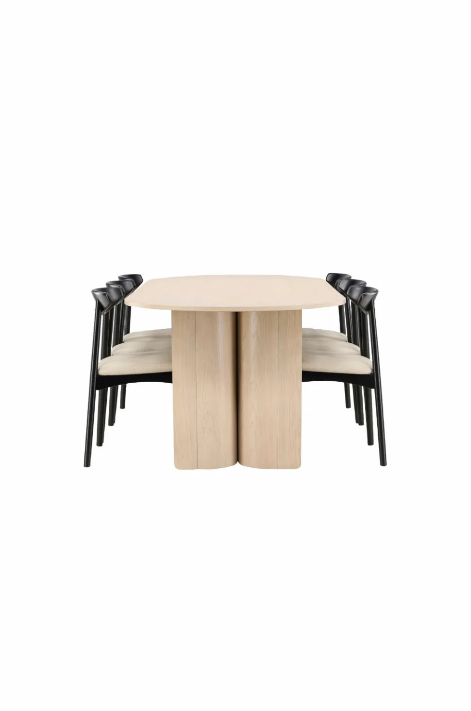 De medfølgende ven stole har et sort stel, der harmonerer med bordet, mens den beige sædehynde giver en varm og blød kontrast. Sammen danner de en afbalanceret komposition, der passer lige så godt til hverdagens måltider som til større sammenkomster.