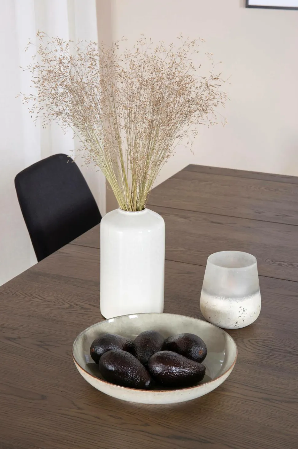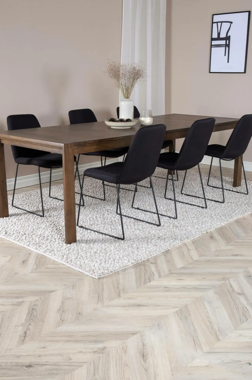 Du behøver ikke at gå på kompromis mellem klassisk og moderne – dette spisebordssæt går aldrig af mode! Spisebordsskyderen med egetræslook imponerer med sit varme og naturlige udseende. Bordet kan forlænges efter behov, og de lige nordiske former skaber et luftigt og moderne helhedsindtryk i rummet. Her i perfekt kombination med spisebordsstole fra muce-serien. Stolen har et stilfuldt, fuldpolstret, minimalistisk design. Det smalle benstativ er lavet af pulverlakeret metal. Ryggen og sædet er betrukket med polyesterstof med blød polstring for ekstra komfort. Sid behageligt og indret smart!