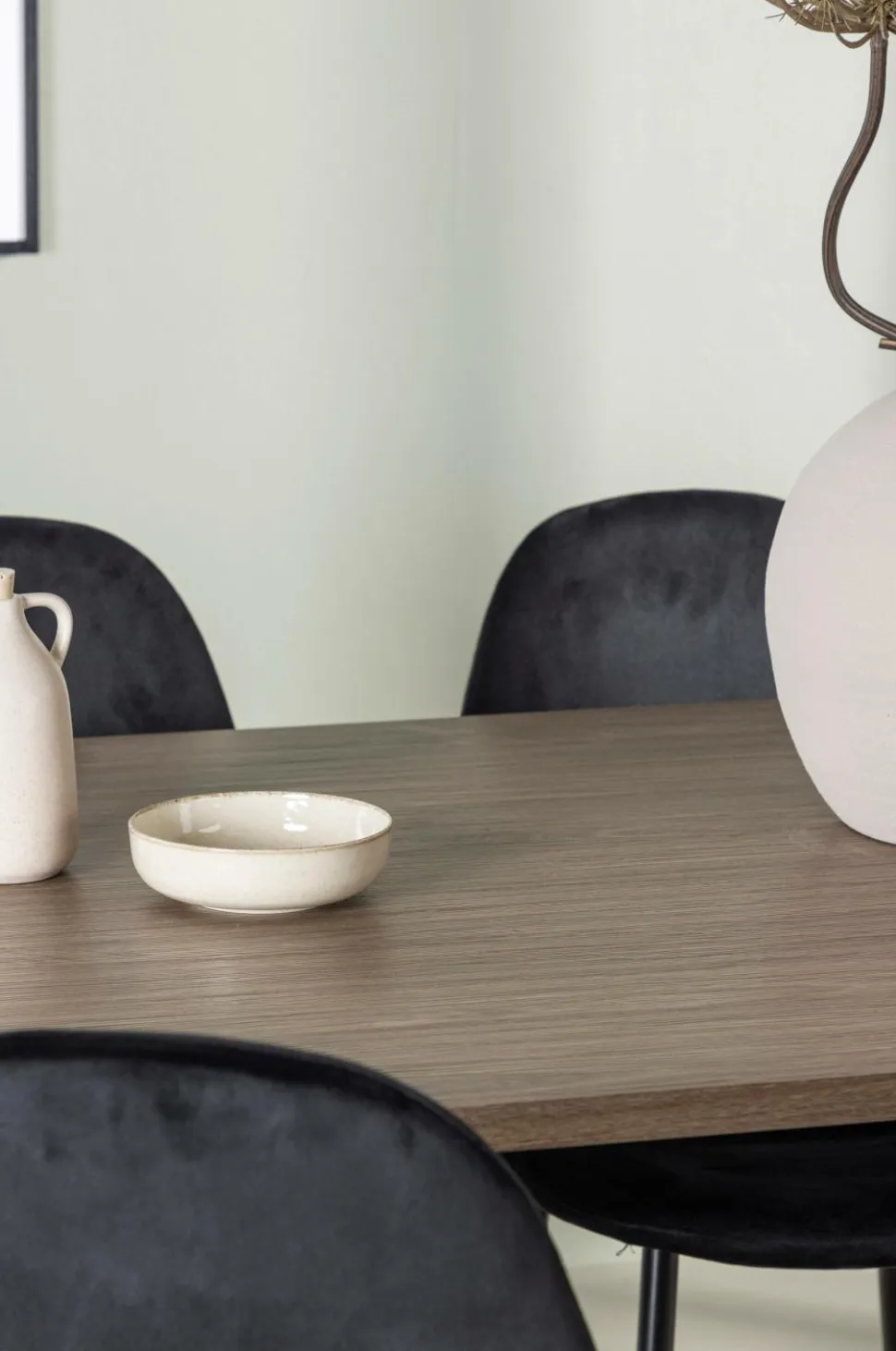 Dette spisebordssæt indeholder fire stole, hvilket gør det ideelt til mindre sammenkomster og familiemiddage. Med sit skandinaviske design og markante udseende bliver dette ensemble en elegant indretningsdetalje, der løfter atmosfæren i hele rummet. Perfekt til at skabe et stilfuldt og indbydende spisestuemiljø.