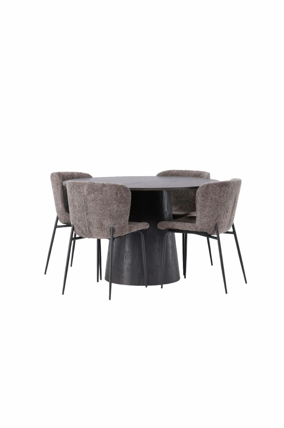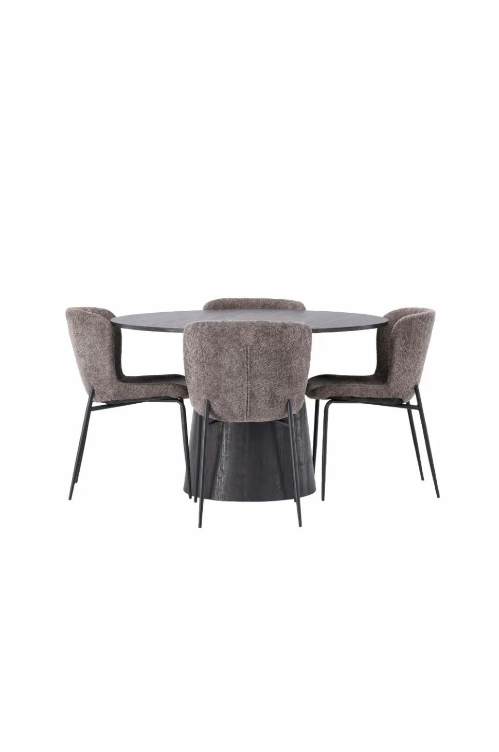 Varm stemningen op med en jordnær spisegruppe! Venture Designs vidunderlige, runde spisebord Lanzo har et gennemgående helhedsdesign i MDF med en tynd bordplade og et snoet cylinderformet stel, der er centreret under midten af bordet. Her sammen med trendy spisebordsstole fra serien Modesto. Stolen er fuldpolstret med lodnet stof med stilfulde smalle metalstoleben. Det let rundede ryglæn og den polstrede siddehynde giver ekstra komfort og forlænger hyggelige måltider omkring spisebordet.