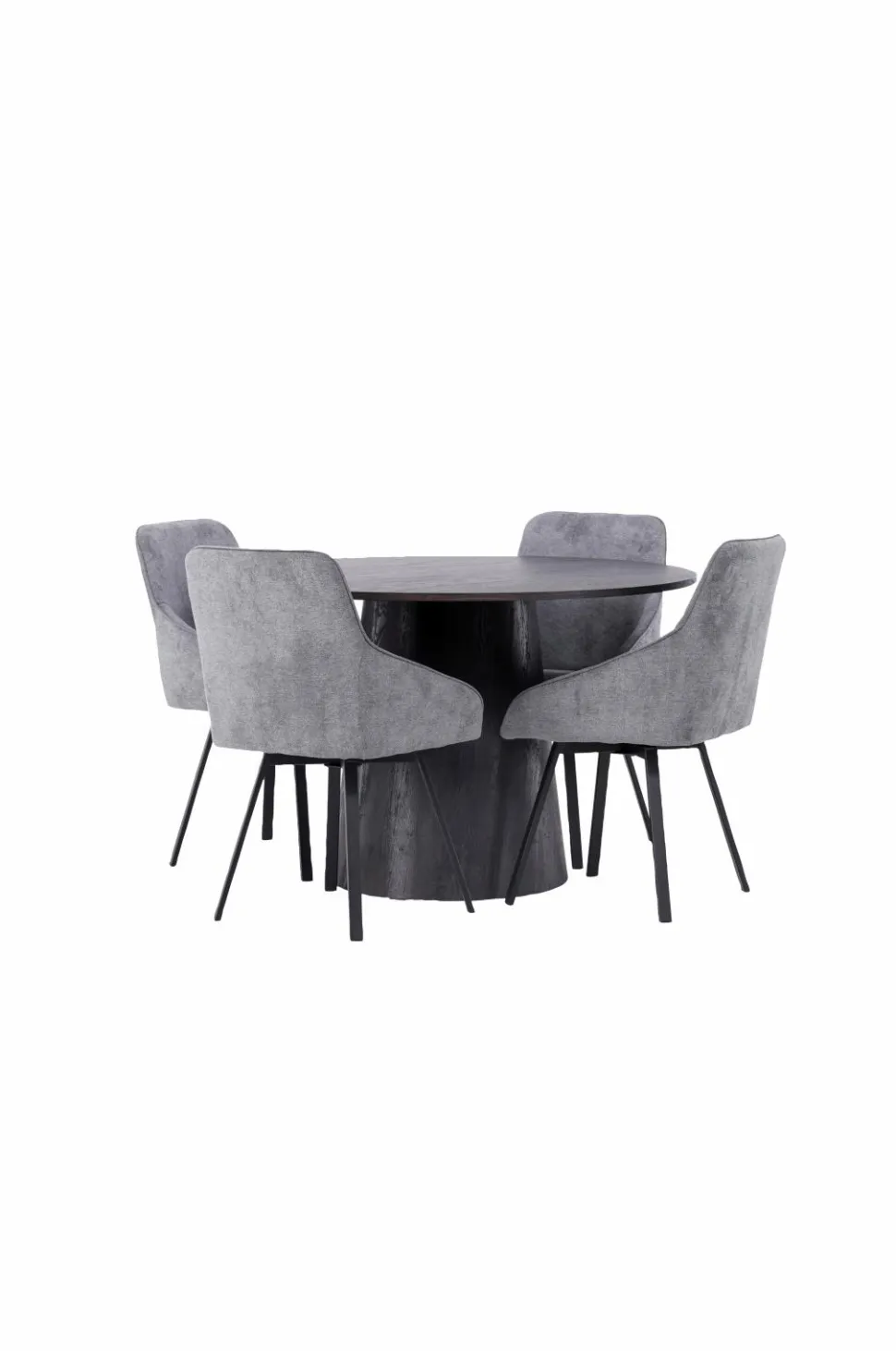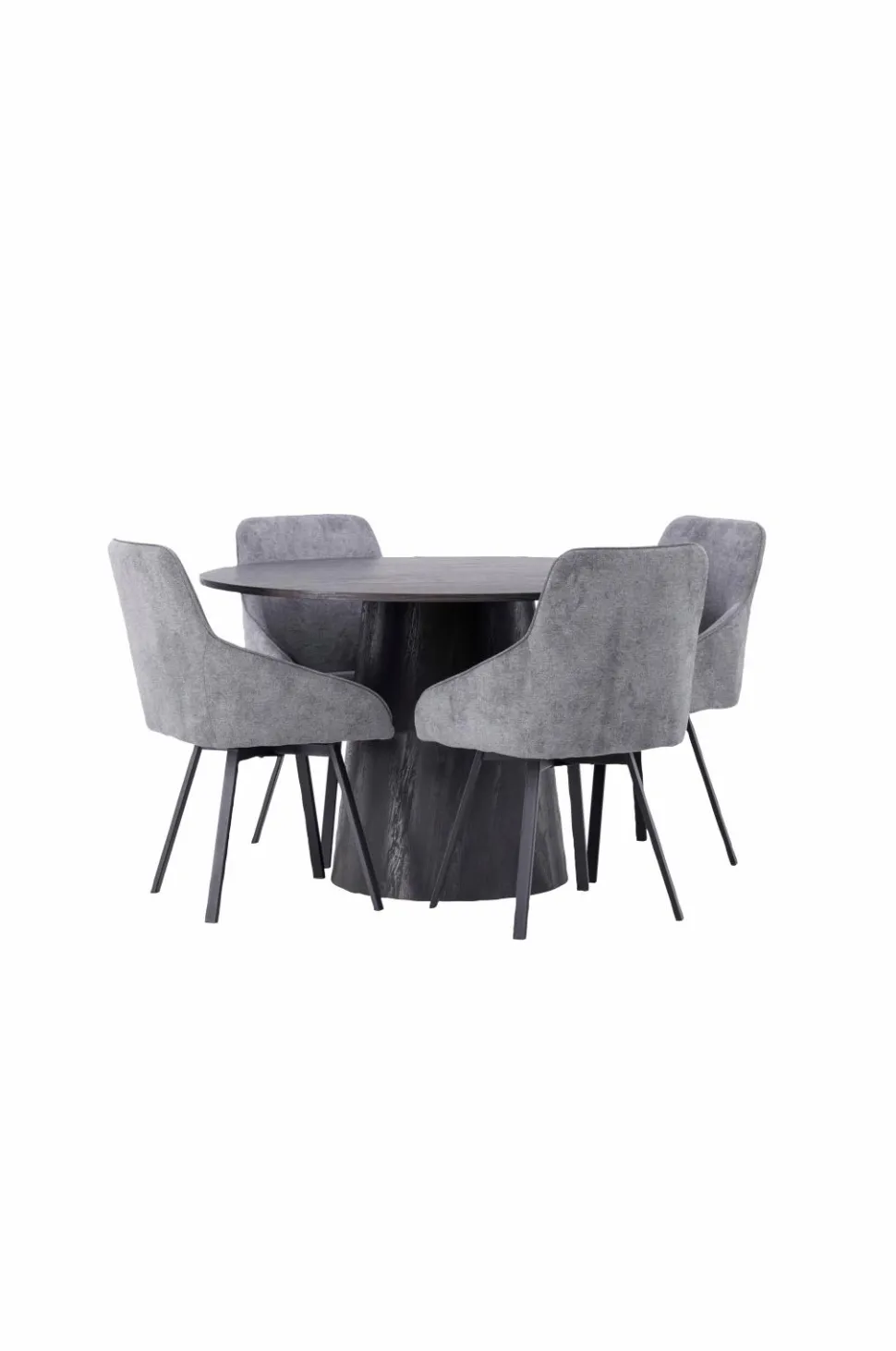 En behagelig spisegruppe i bløde toner! Venture Designs vidunderlige, runde spisebord Lanzo har et gennemgående helhedsdesign i MDF med en tynd bordplade og et snoet cylinderformet stel, der er centreret under midten af bordet. Her i stilren kombination med vores stole fra serien Rosie. Stolen har et fuldt betrukket sæde med integrerede stofarmlæn og let skrå stoleben i metal. Det bløde sæde er polstret for ekstra komfort og inviterer dig til lange behagelige middagsstunder.