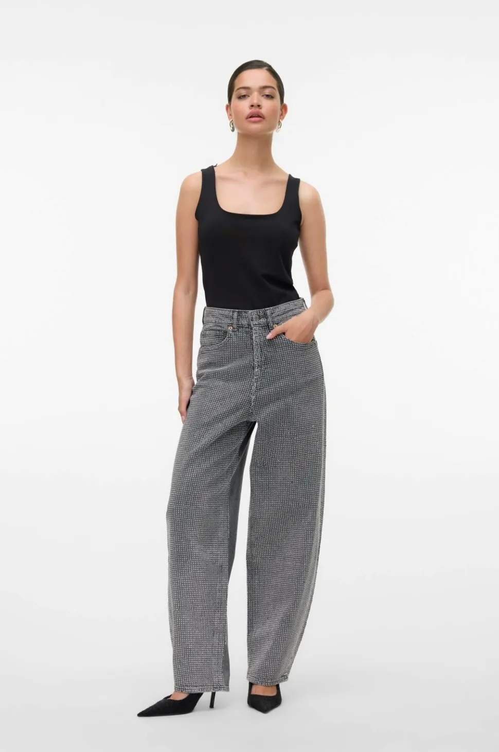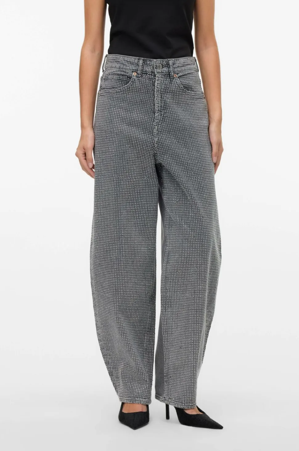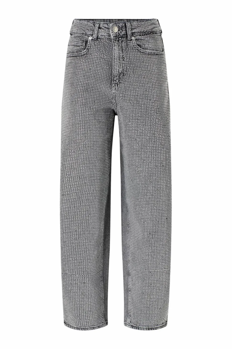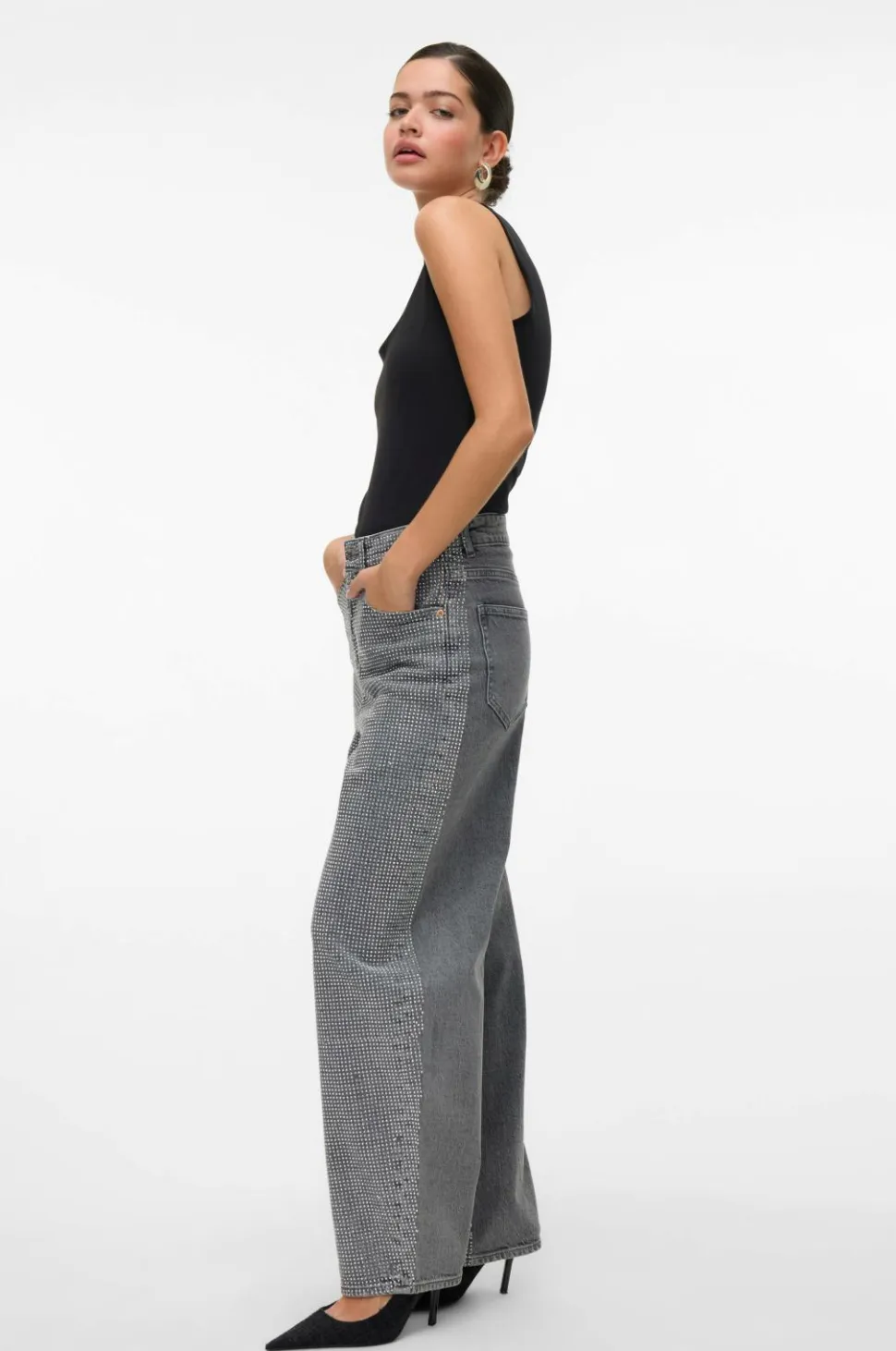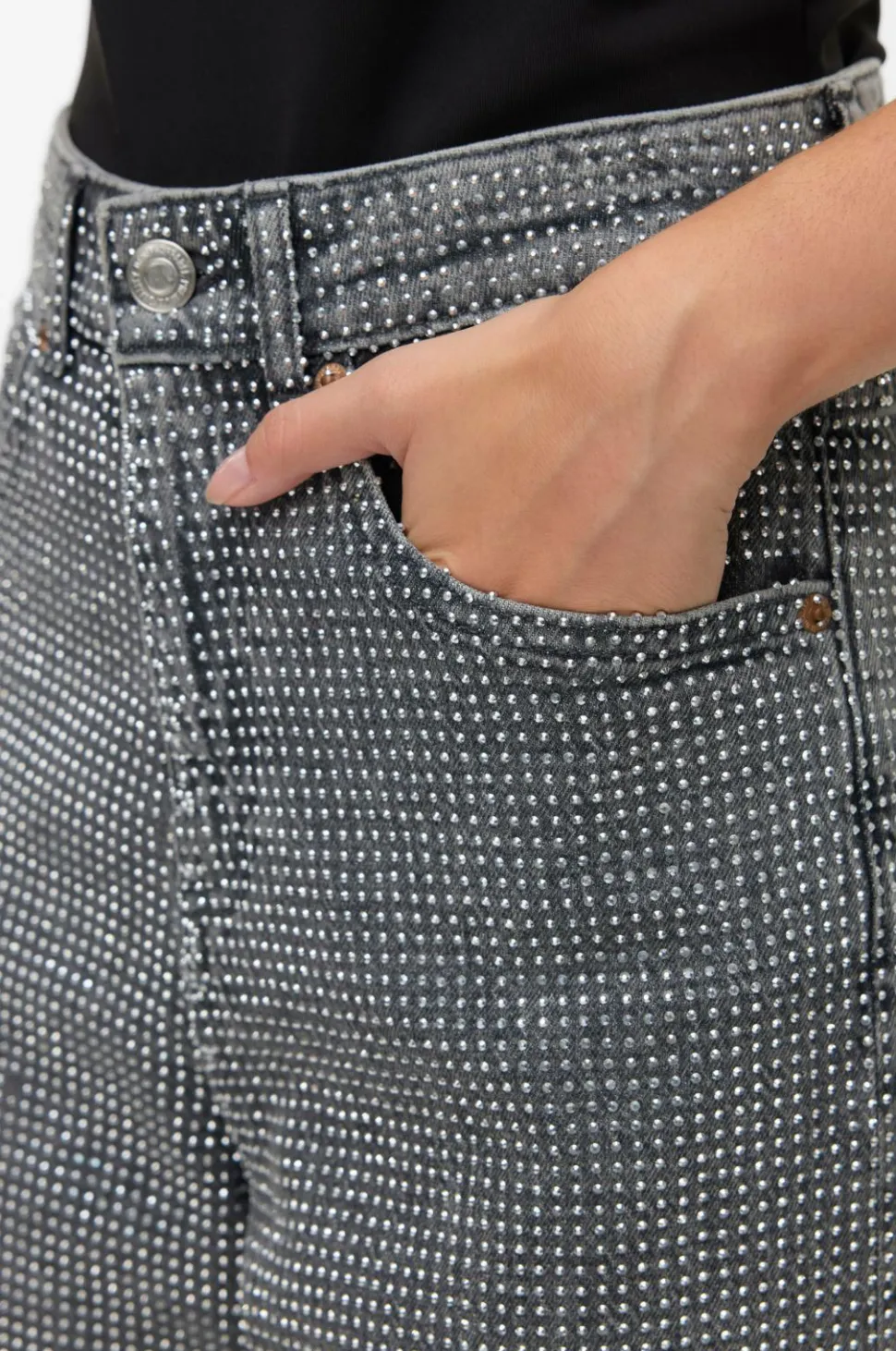 • Højtaljede jeans med rhinstene foran