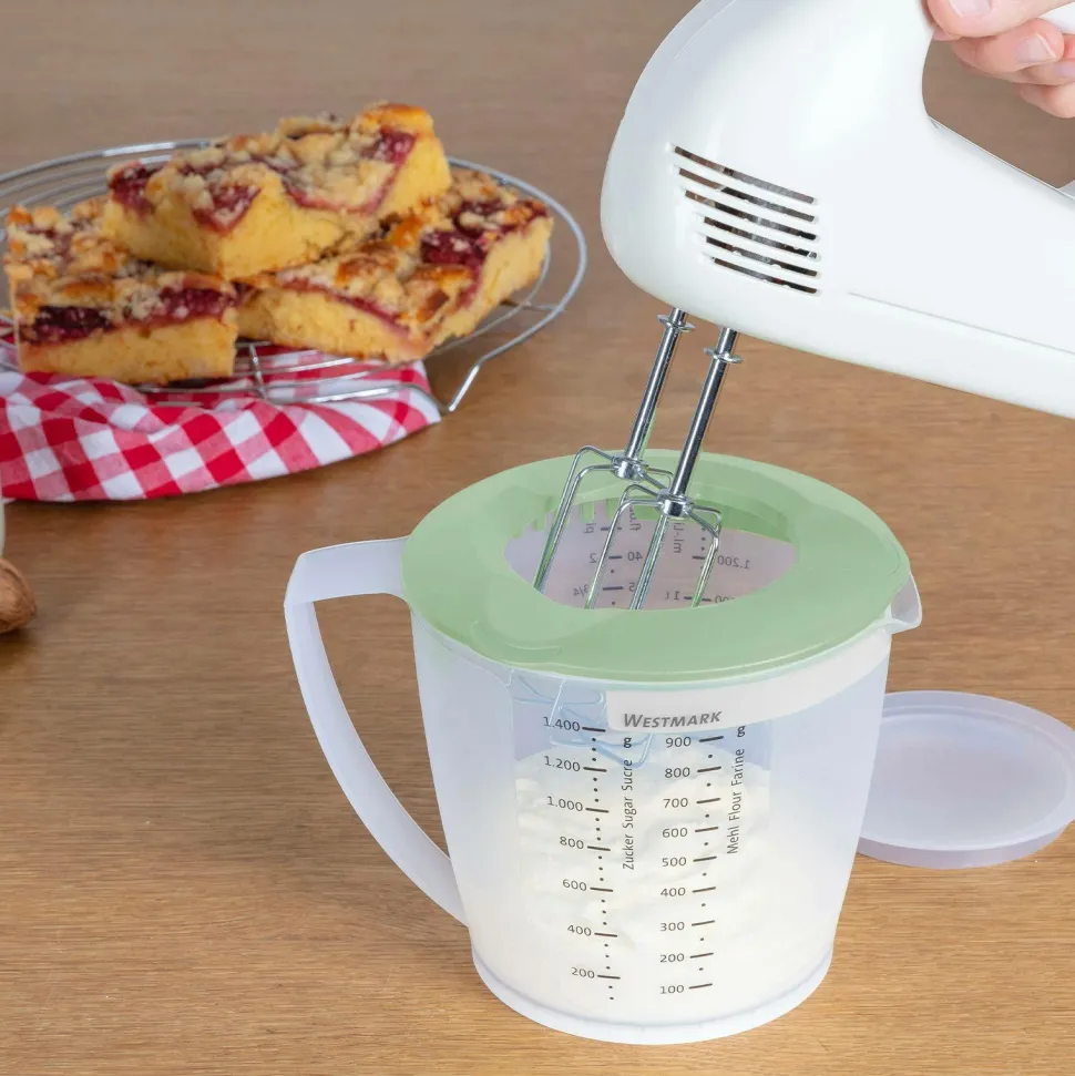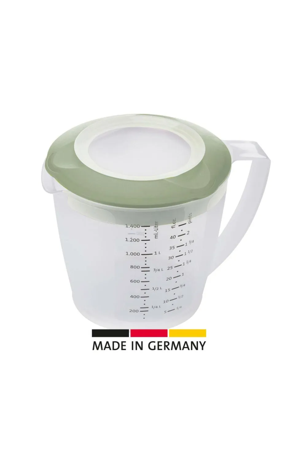“helena” – den ultimative 1,4-liters blandekande til ethvert køkken, nu i en smuk blå nuance. Designet med et todelt låg, der inkluderer en hældetud med en si, perfekt til både servering og opbevaring. Den er udstyret med måleskalaer for de, gb, fr i ml, liter, pints og gram, hvilket gør den ideel til mange forskellige anvendelser. En skridsikker ring i bunden sikrer stabilitet under brug.