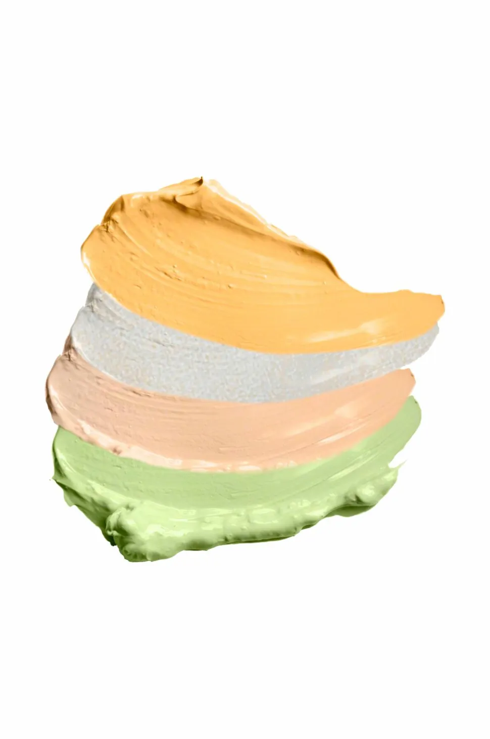 Concealer som skjuler mørke rande under øjnene samt rødme og andre hudproblemer med de fire forskellige nuancer beige, grøn, hvid og rosa.