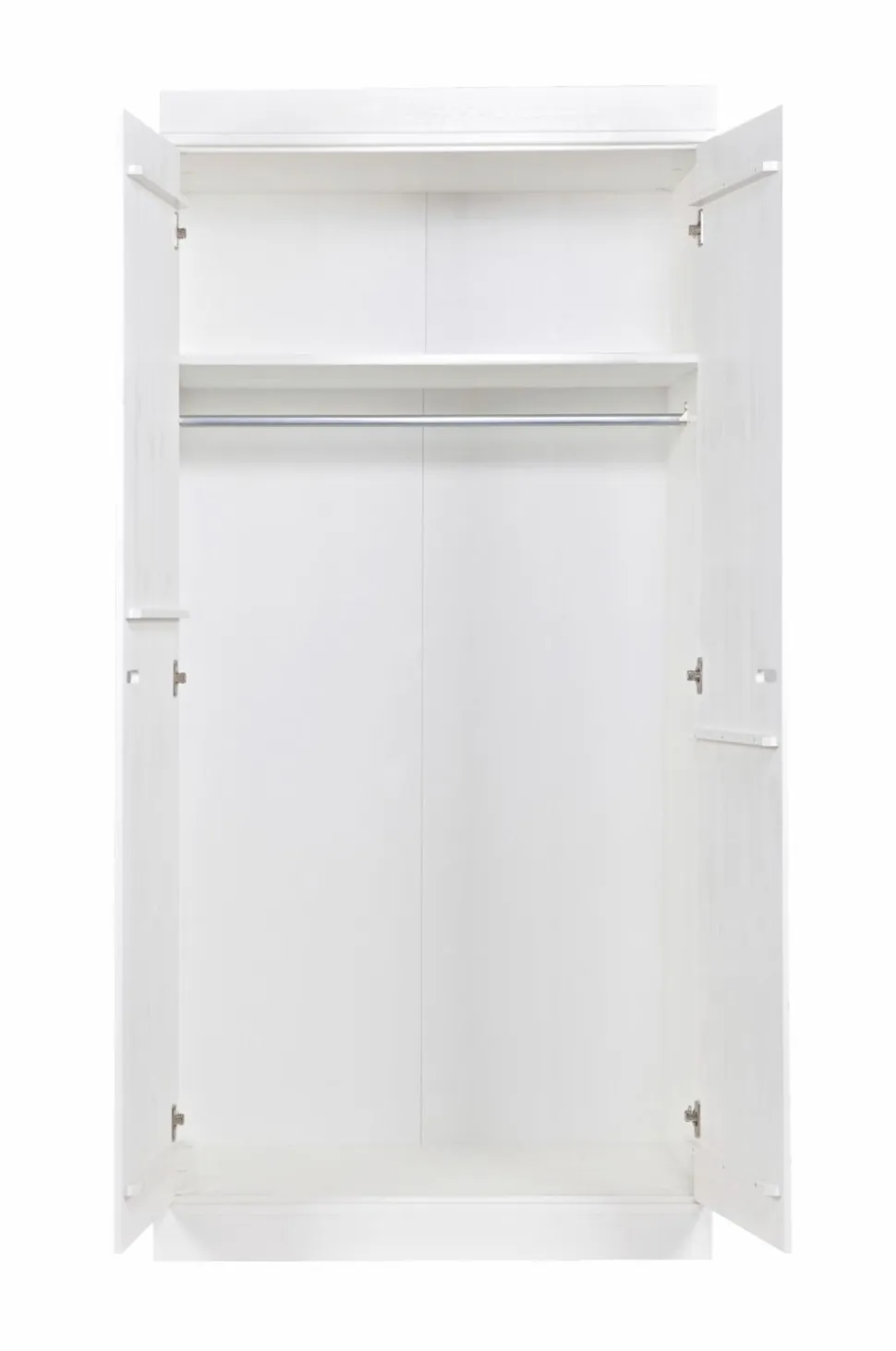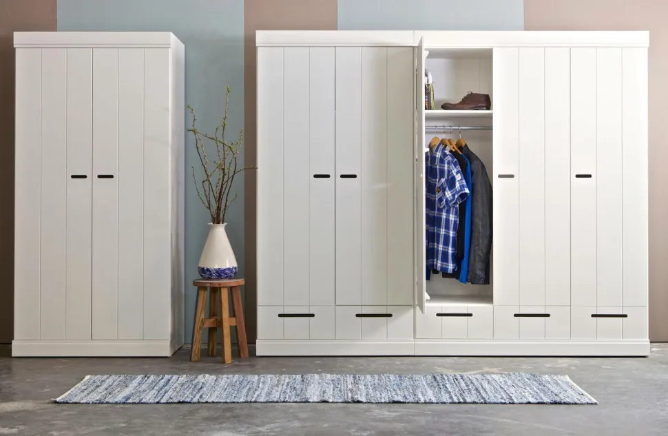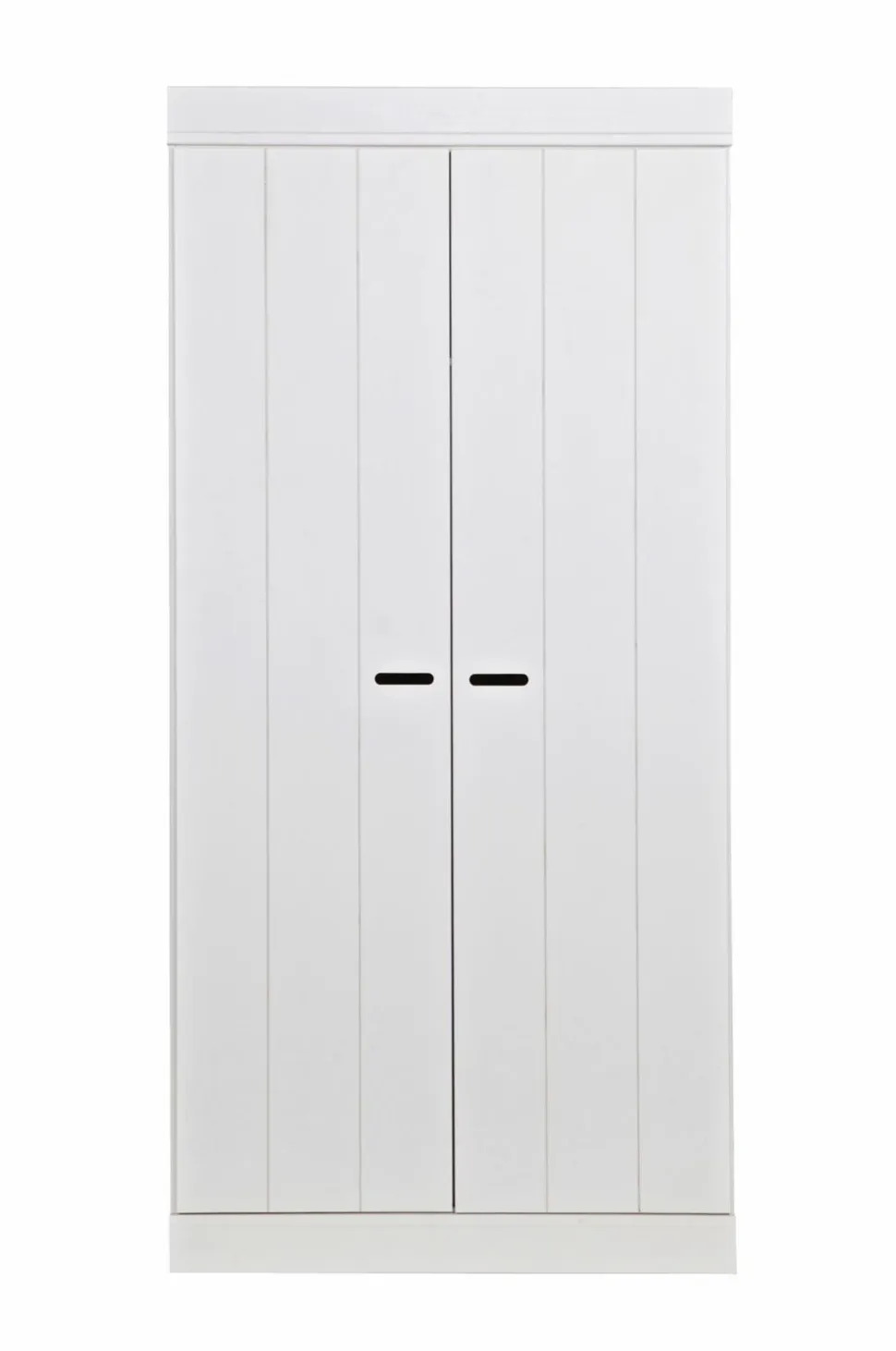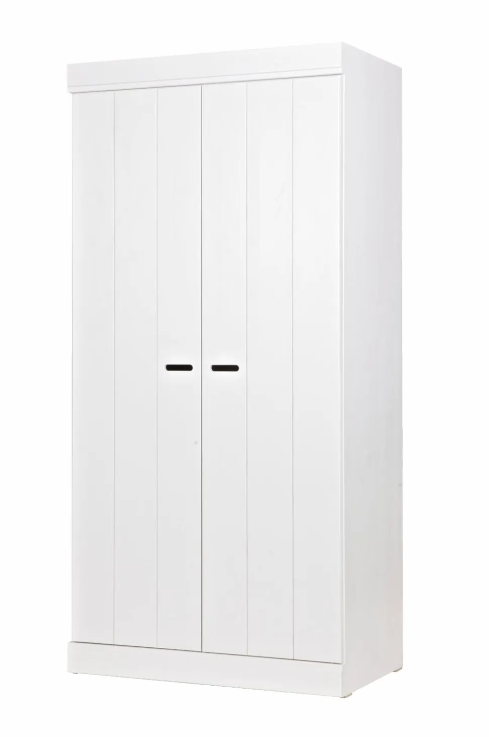 Fra CONNECT-serien; et robust garderobeskab med 2 låger og 2 praktiske skuffer (udstyret med robuste metalstyr til skufferne). Med CONNECT-skabet kan du bygge din egen skabsvæg! CONNECT-skabet er lavet i massiv fyrretræ. Indersiden er udstyret med laminerede hylder, praktiske at rengøre! Skabet er malet hvidt, men du kan også nemt male det i en anden farve (brug vandbaseret maling).
