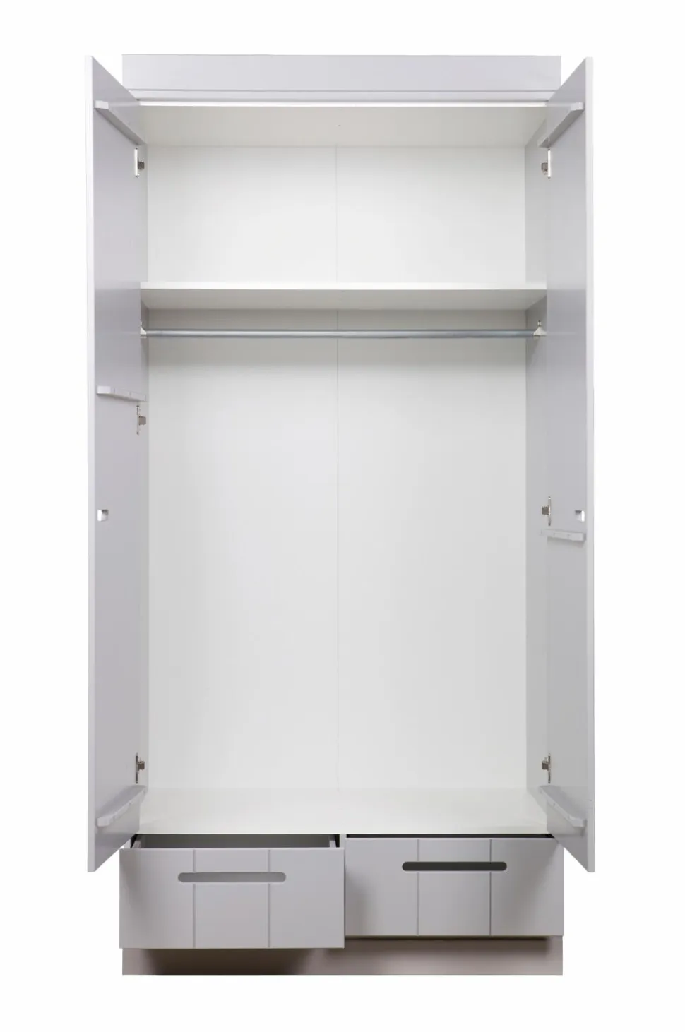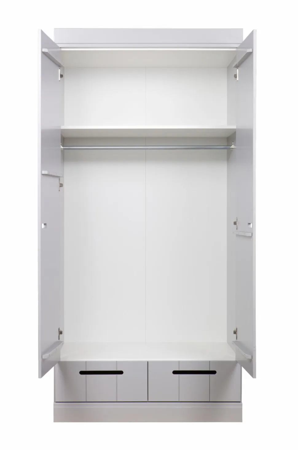 Fra CONNECT-serien; et robust garderobeskab med 2 låger og 2 praktiske skuffer (udstyret med robuste metalstyr til skufferne). Med CONNECT-skabet kan du bygge din egen skabsvæg! CONNECT-skabet er lavet i massiv fyrretræ. Indersiden er udstyret med laminerede hylder, praktiske at rengøre! Skabet er malet hvidt, men du kan også nemt male det i en anden farve (brug vandbaseret maling).