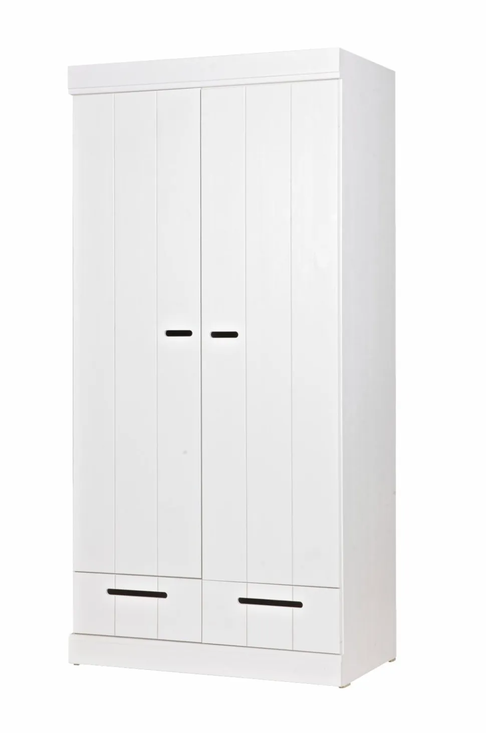 Fra CONNECT-serien; et robust garderobeskab med 2 låger og 2 praktiske skuffer (udstyret med robuste metalstyr til skufferne). Med CONNECT-skabet kan du bygge din egen skabsvæg! CONNECT-skabet er lavet i massiv fyrretræ. Indersiden er udstyret med laminerede hylder, praktiske at rengøre! Skabet er malet hvidt, men du kan også nemt male det i en anden farve (brug vandbaseret maling).