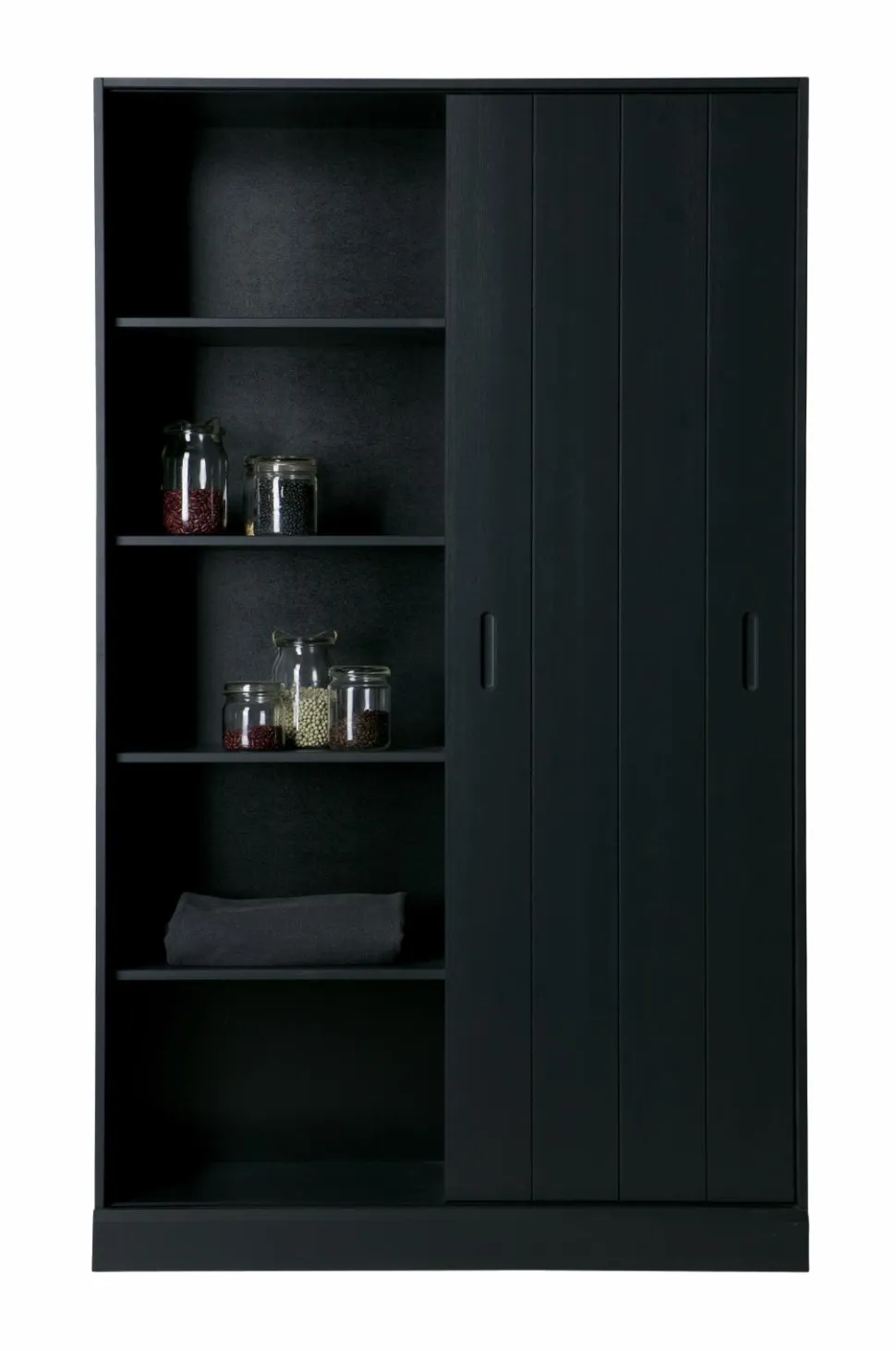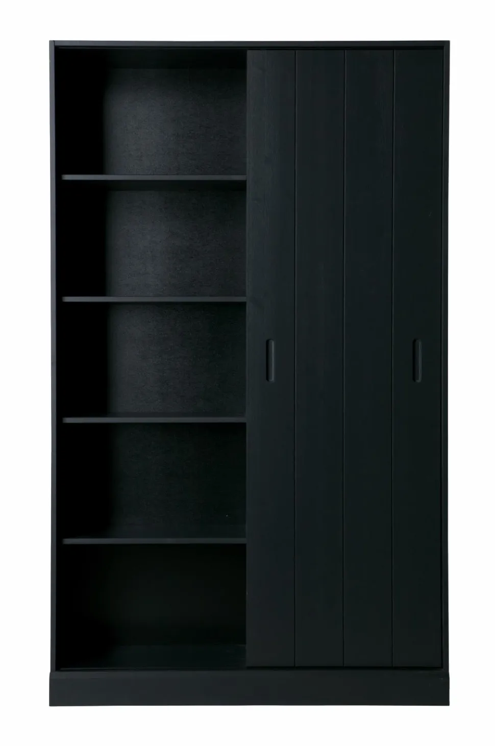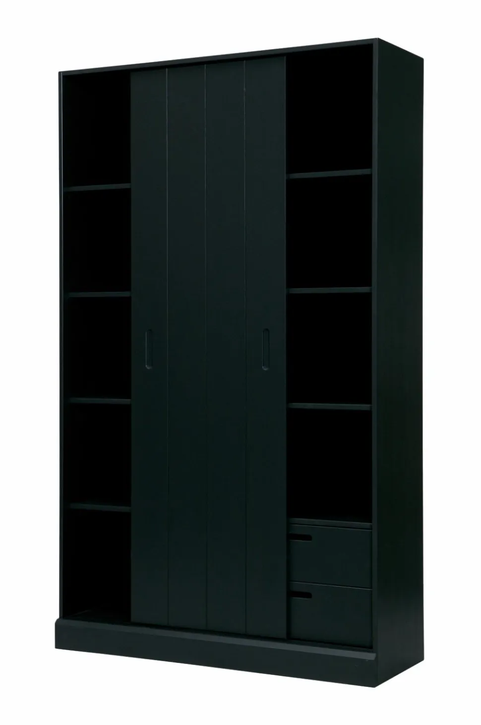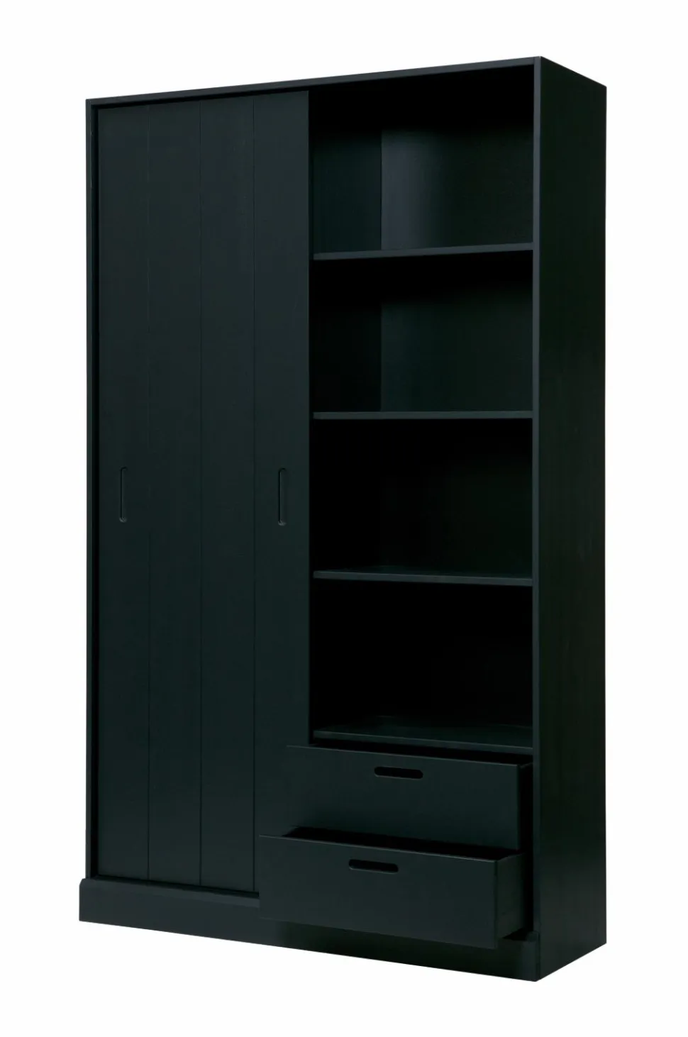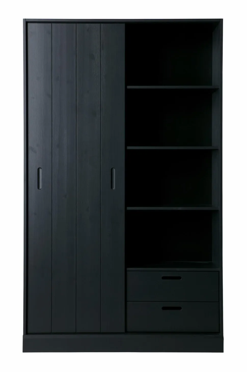 Et rummeligt skab med et trendy look og masser af opbevaringsplads. Træet har en slebet finish som giver skabet et ekstra råt udseende. Skabet har en bredde på 120 cm og har 9 store opbevaringsrum samt en praktisk skydelåge. Skydelågen sparer plads og gør det muligt at skjule nogle rum. I højre side af skabet er der yderligere to skuffer længst nede. Du kan vælge om du vil køre skydelågen hen foran skufferne eller om du vil kunne se de fine skuffer. Et skab som dette passer perfekt ind i et moderne interiør.