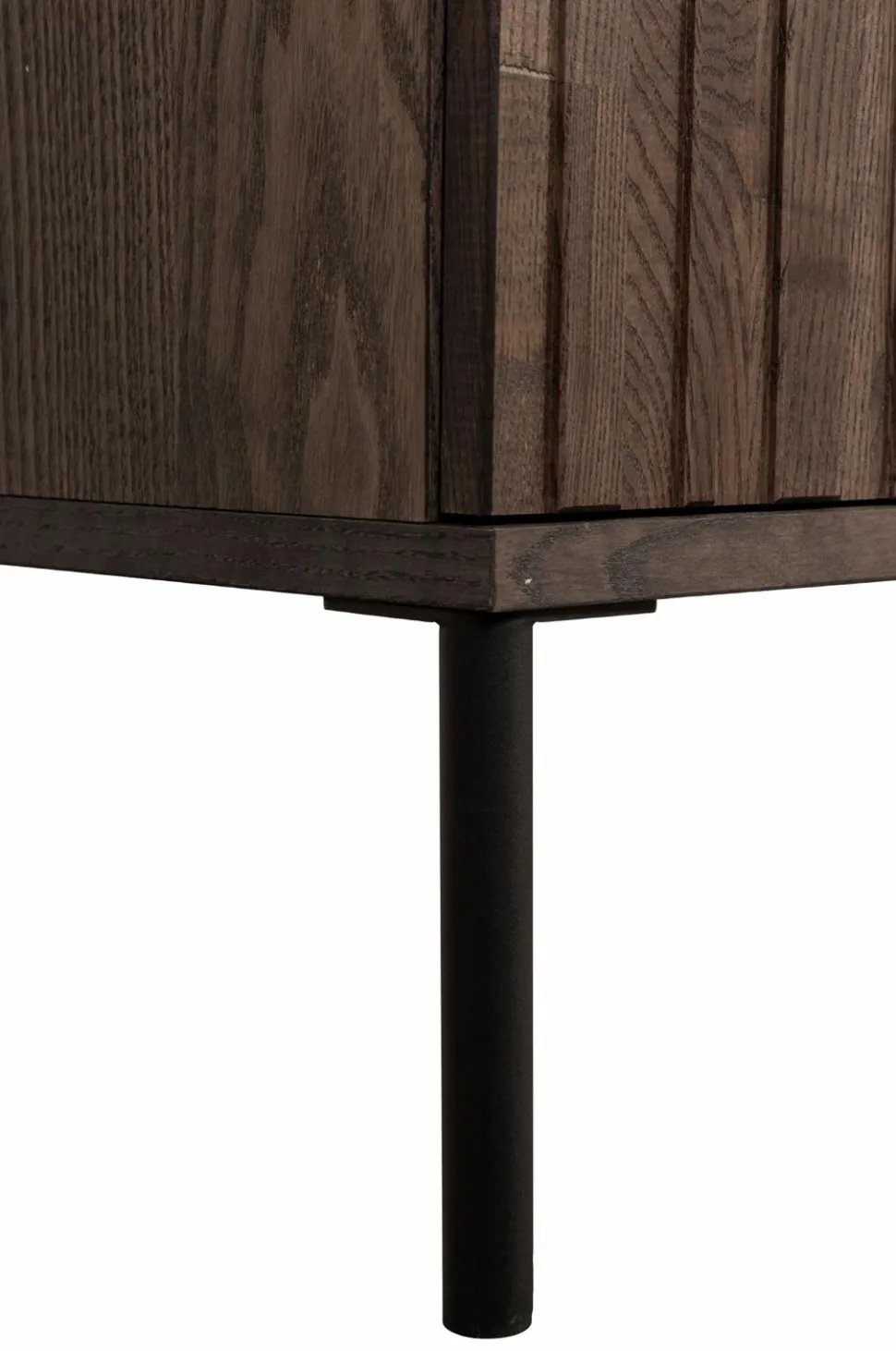 Vores populære kollektion Gravure i ny udgave! Gravure New tv-bænk er en del af kollektionen fra det hollandske indretningsmærke WOOOD og findes i to størrelser: bredde 100 cm og 150 cm. Gravure New tv-bænk er lavet af ask med finish i den brune farve espresso. Indersiden er lavet i sort spånplade. Benene er fremstillet af sortmalet metal. TV-bænken Gravure New har to låger med støjsvagt push-to-open-system og en praktisk skuffe.