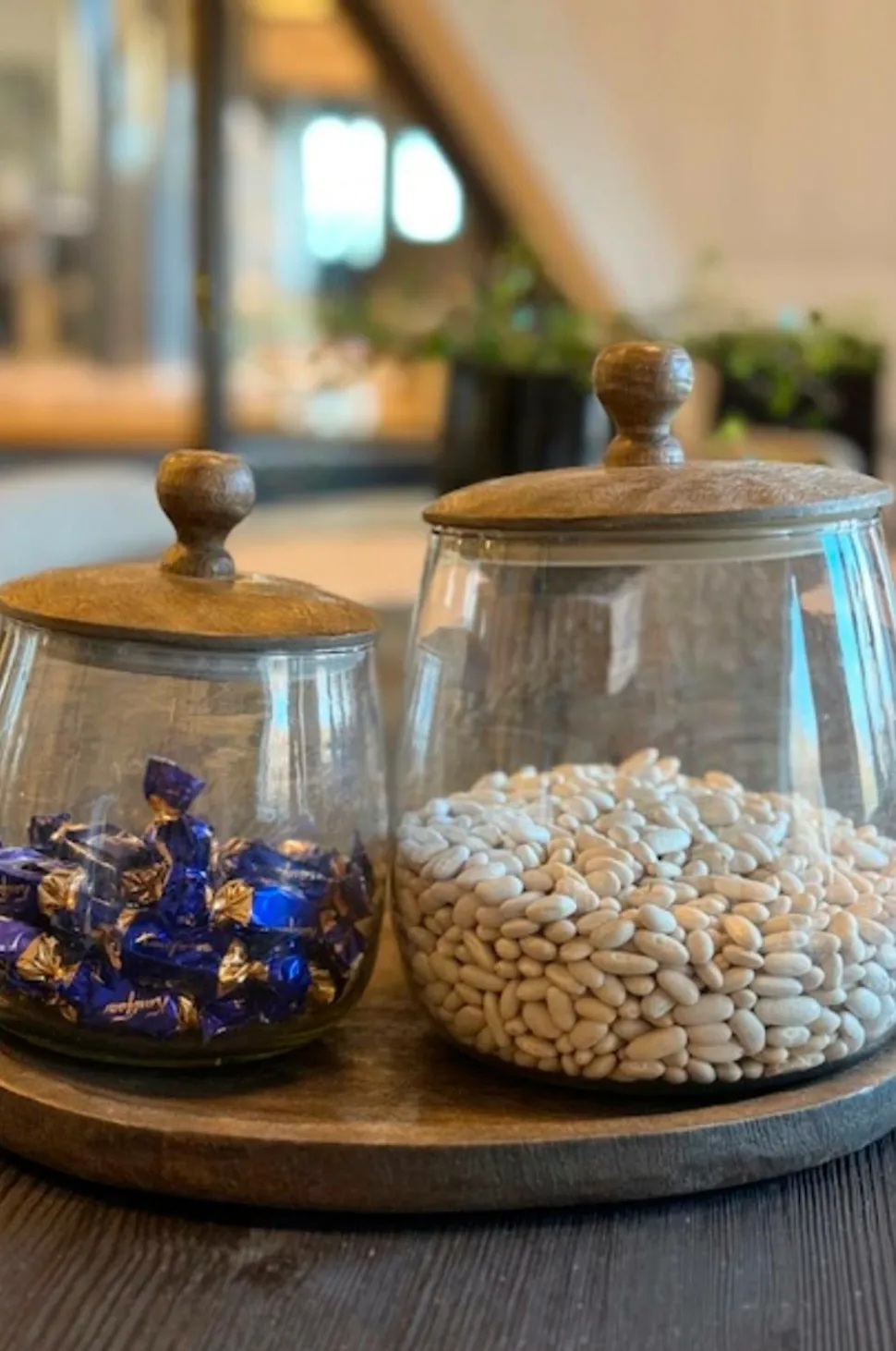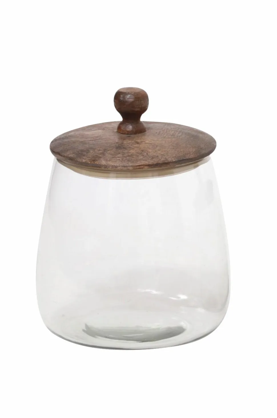 Glaskrukke med håndlavet trælåg. Dekorativ at have stående i køkkenet. Glasset er håndblæst af genbrugsglas, derfor kan der forekomme forskydninger og små bobler.