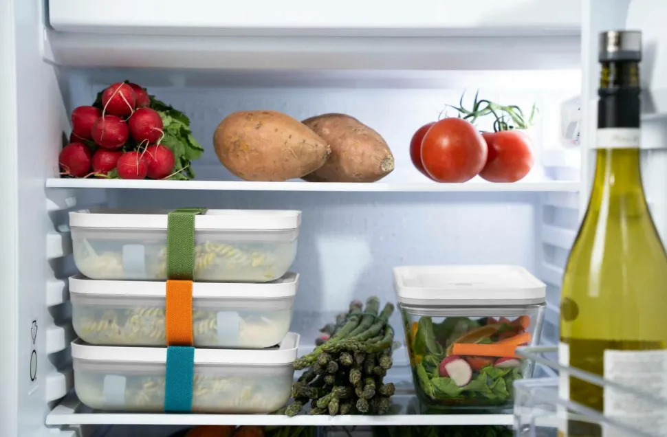 platsbesparande stapelbar förvaring av mat och måltider i kylskåp och frys