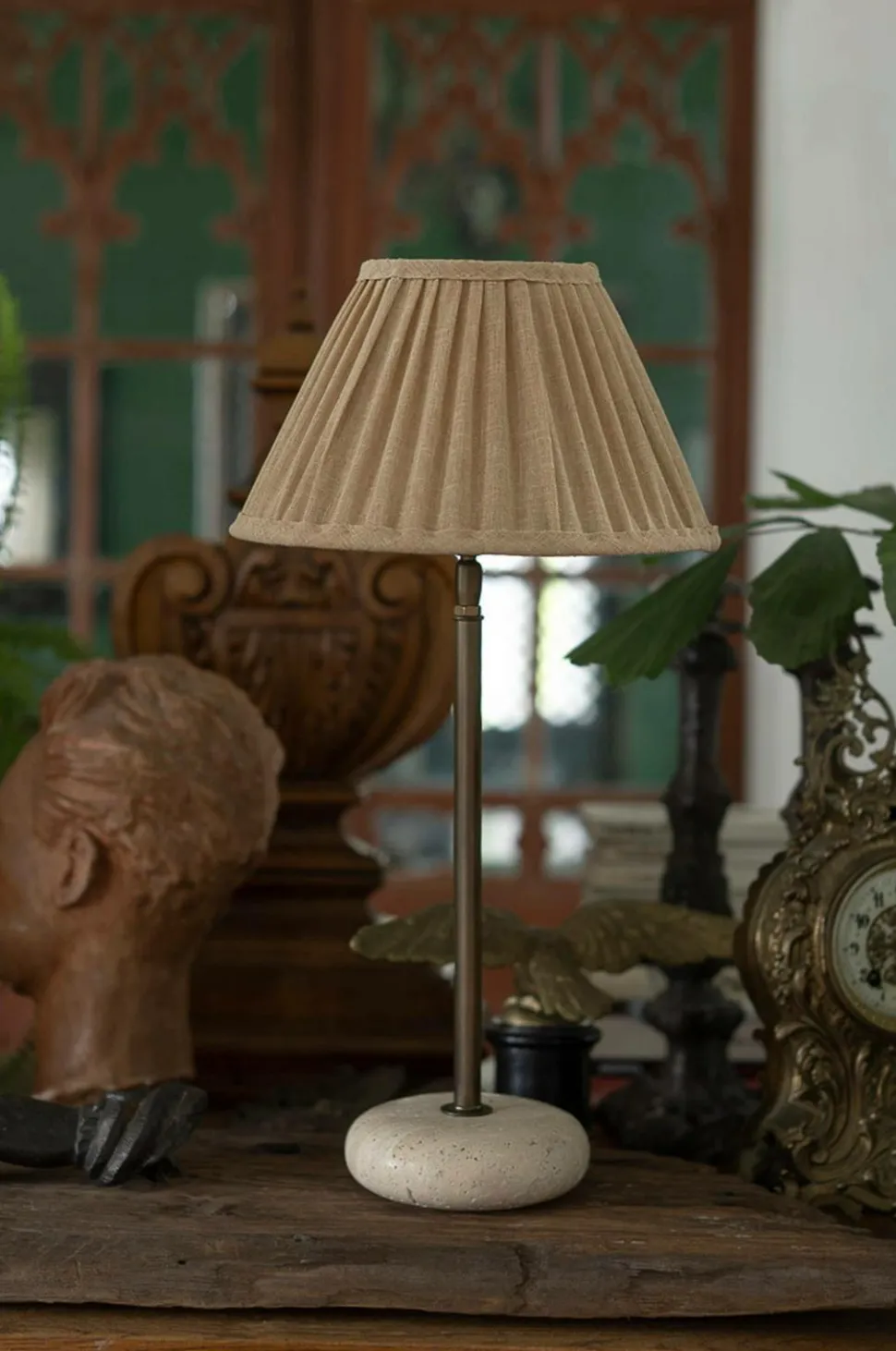 En smuk bordlampefod. Foden er drejet til en blød, afrundet form. En robust og stabil lampefod med antikfarvede messingdetaljer. Materialet er naturligt, og hver lampe er unik, da stenens farve varierer fra stykke til stykke. Praktisk med en kontakt på lampeholderen.