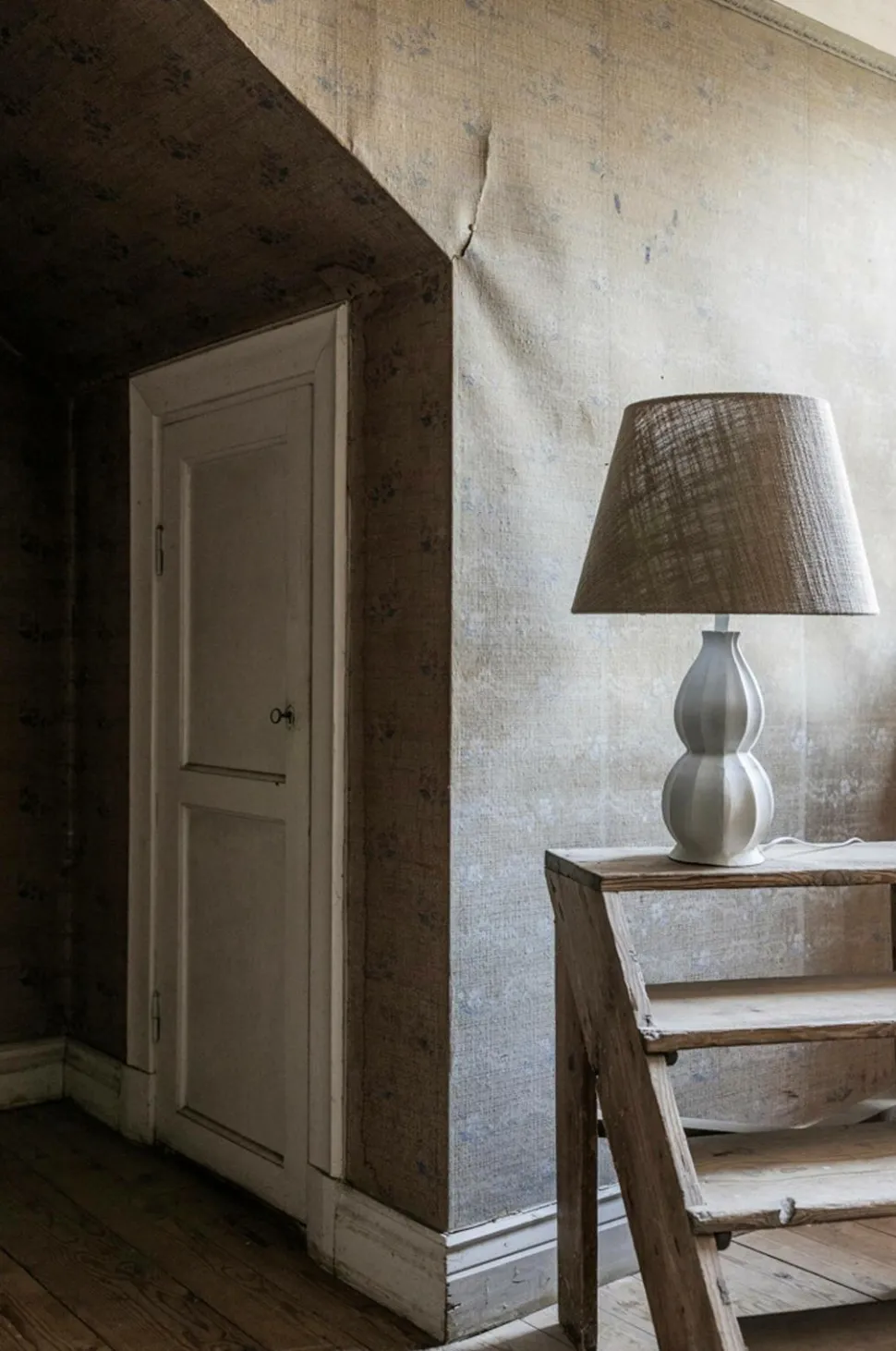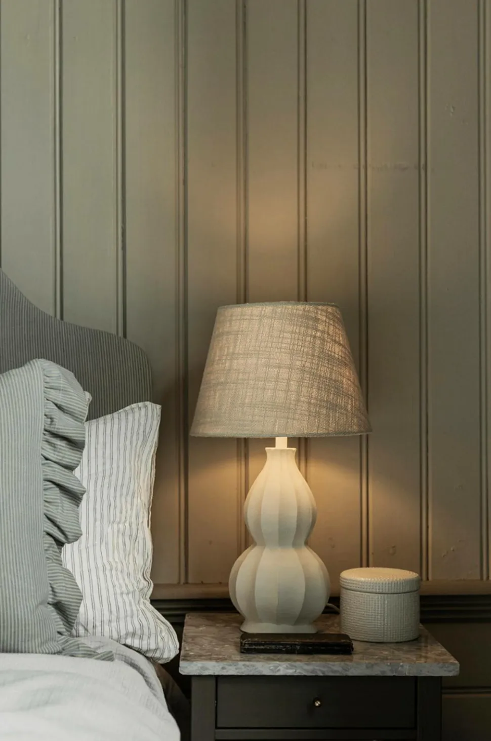 Lampesokkel med oval form. Overfladen har en lys stribe og finishen er mat hvid. Gusso er en lampesokkel, der er velegnet til at placere i et vindue eller på en skænk, da den ovale form ikke kræver meget dybde. Kombiner den gerne med en af vores ovale skærme.