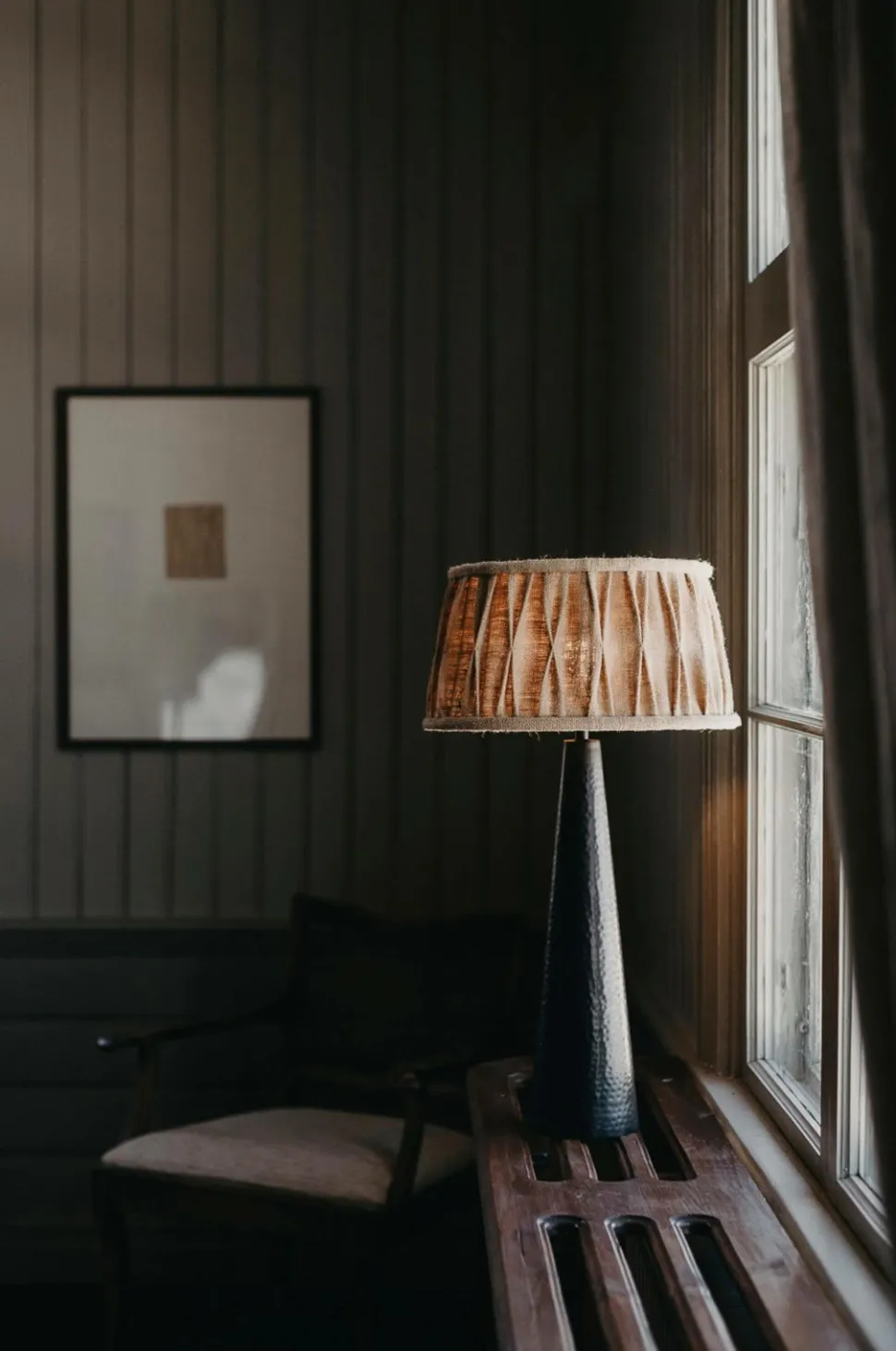 En klassisk syet skærm, der får et moderne udtryk med valget af ru jutestof. Har et låg, der forhindrer blænding fra lyskilden. Passer til flere af vores lampesokler.