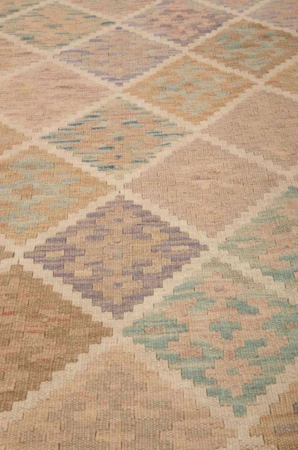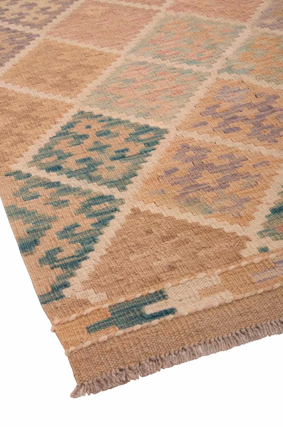 Et klassisk vævet tæppe med et heldækkende geometrisk mønster. Det vegetabilsk farvede garn garanterer en smuk og harmonisk farveskala, og fordi det er vævet i 100 % uld, er det både varmt og smudsafvisende. Et tæppe, der er nemt at placere, og som passer lige så godt foran den knitrende ild i din yndlingslænestol som i køkkenet. Alle vores kelim multi er vendbare, så du kan bruge begge sider af tæppet.