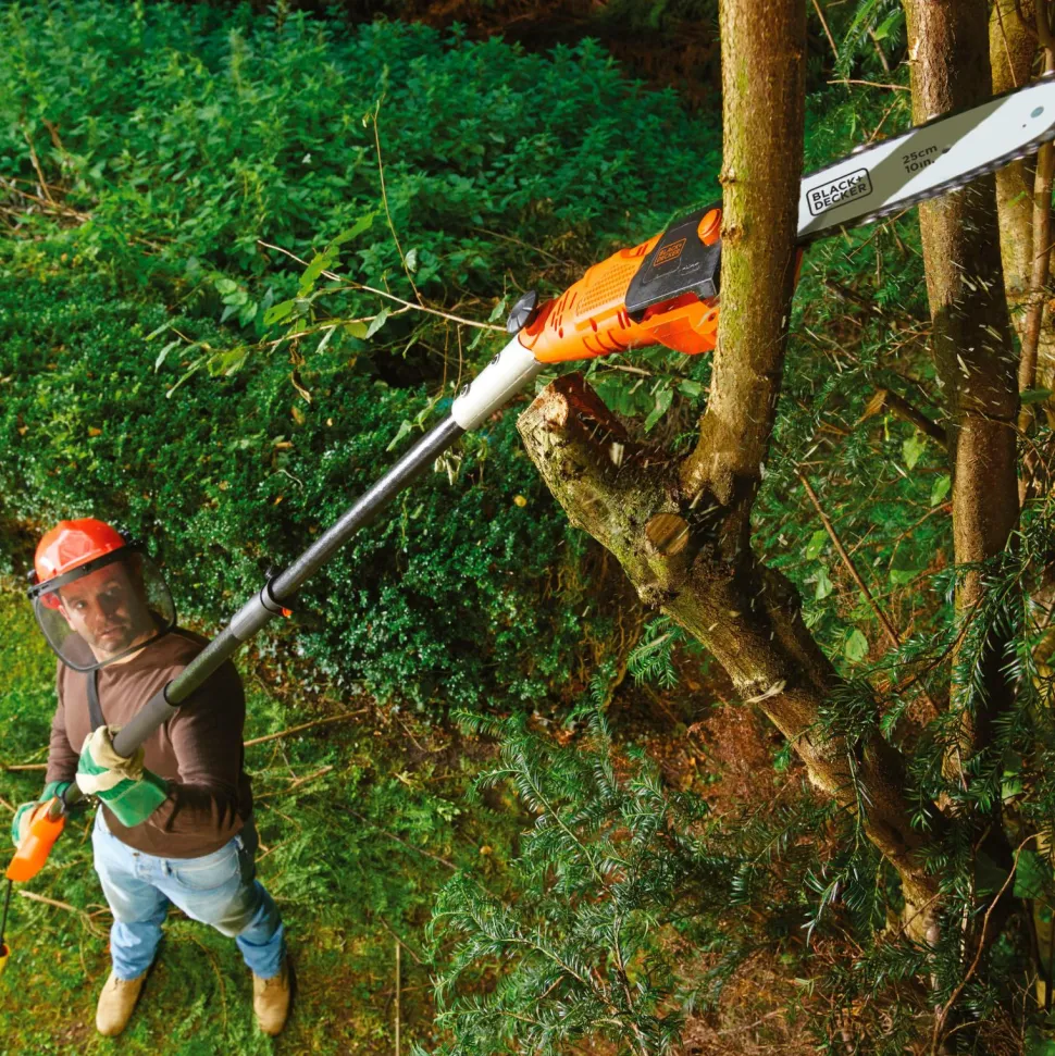 Black & Decker PS7525-QS er en kraftfuld stangsav designet til beskæring af træer. Den skærer nemt grene over og fremmer træernes sundhed. Den kan skære gennem grene, der er op til 25 cm tykke, og dens udtrækkelige skaft når op til 2,7 meter.