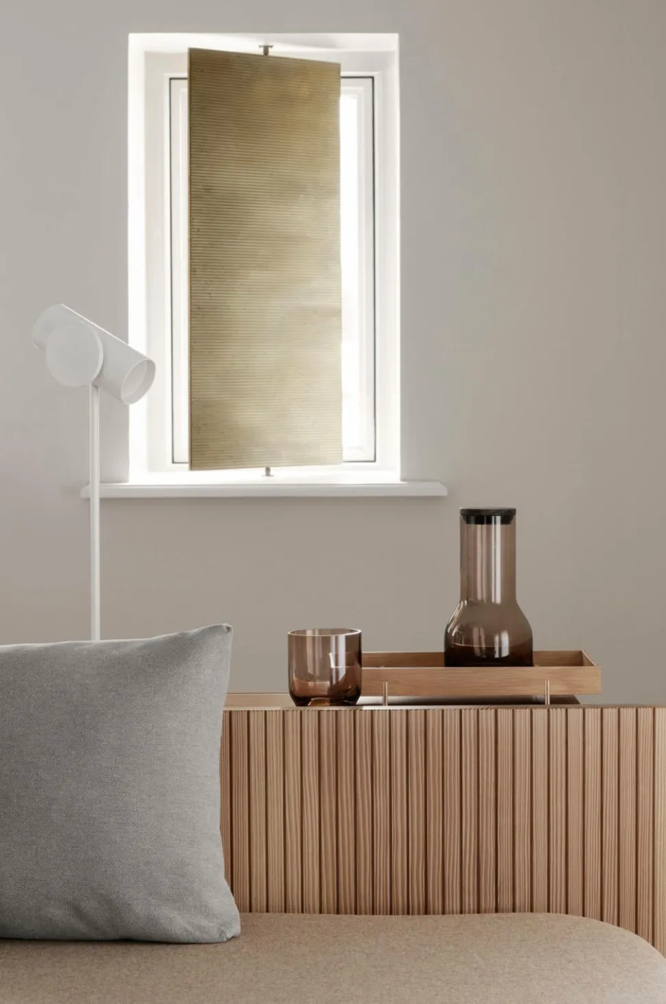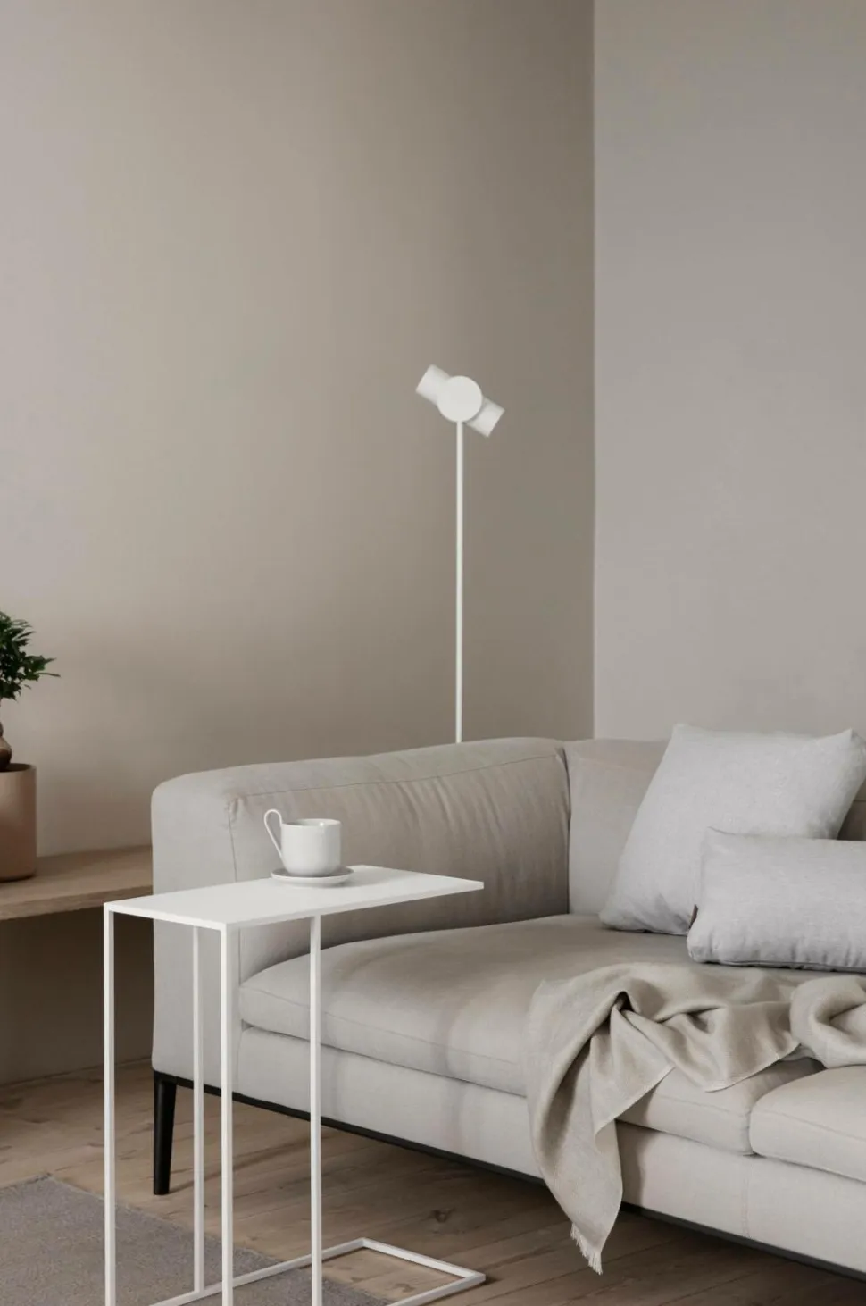 Gulvlampe med LED inspireret af vertikale skulpturer og det klassiske mikrofonstativ. Design af AD Miller i Los Angeles. En lampe, hvor detaljerne og udseendet er reduceret til det essentielle. Et delikat design med en stabil holdning. Lampen har tre lysniveauer – fra lys arbejdsbelysning til stemningsfuldt baggrundslys. Lampen har en dæmperfunktion og lyset kan nemt rettes derhen, hvor du har brug for det.