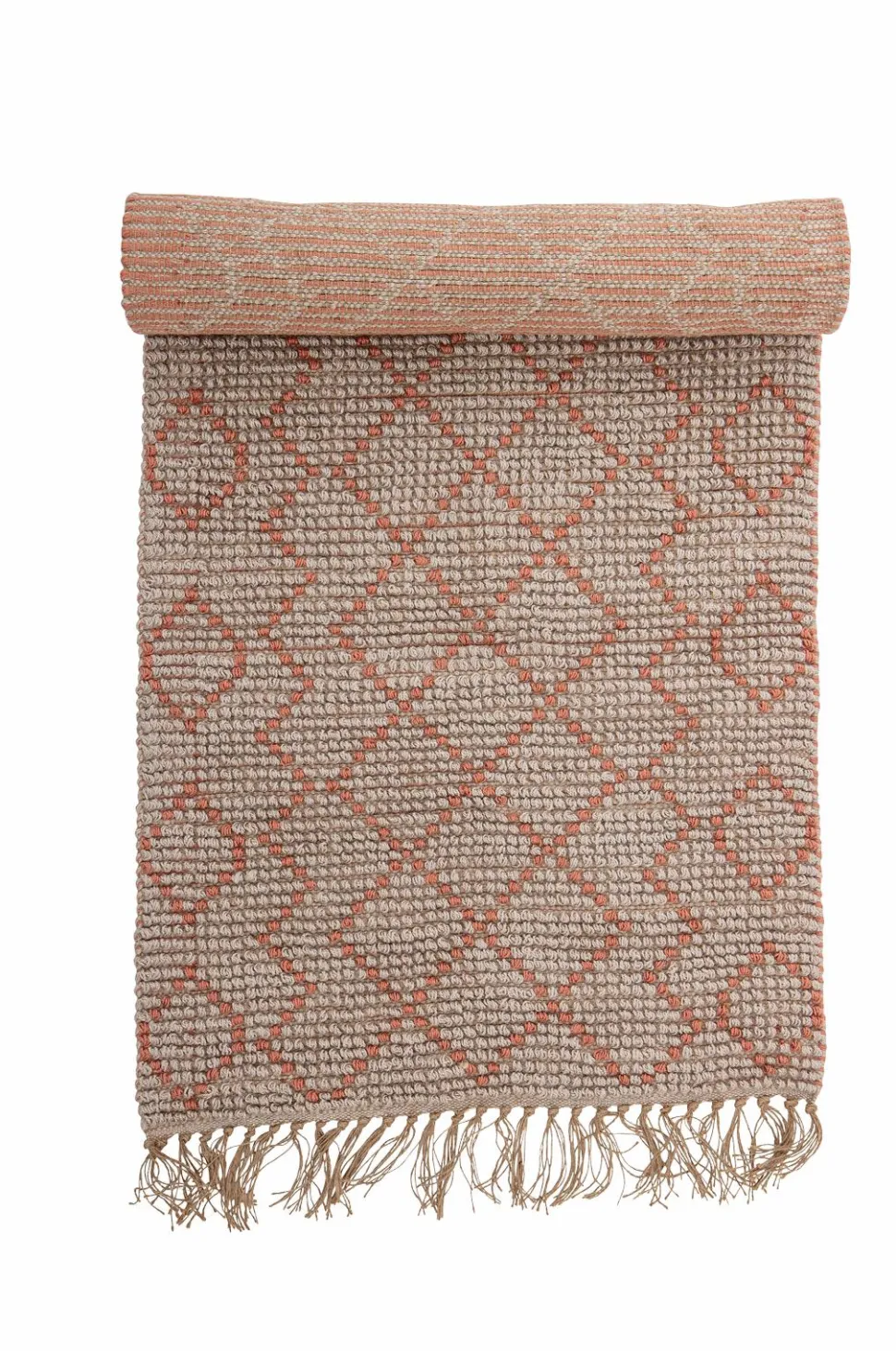 Abriella gulvtæppe fra Bloomingville er et smuk, vævet tæppe af jute. Gulvtæppet har et geometrisk, orange rombemønster på naturfarve, og har frynser i begge sider. Det er så behageligt at du altid vil gå barfodet på det.