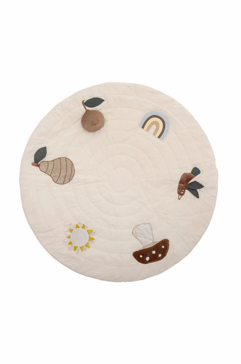 Agnes legetæppet fra Bloomingville MINI er et lille legetæppe med søde figurer, der opmuntrer barnet til at bevæge sig og udforske. Appelsinen giver en lyd, når man ttrykker på den, og pærens blade rasler ved berøring. Der er flere bløde overflader, som er dejlige for baby at røre ved. Samtidig er tæppet designet i afdæmpede farver, der passer ind i alle hjemmets rum. Legetæppet er også en perfekt gave til nybagte forældre. Diameter 100 cm