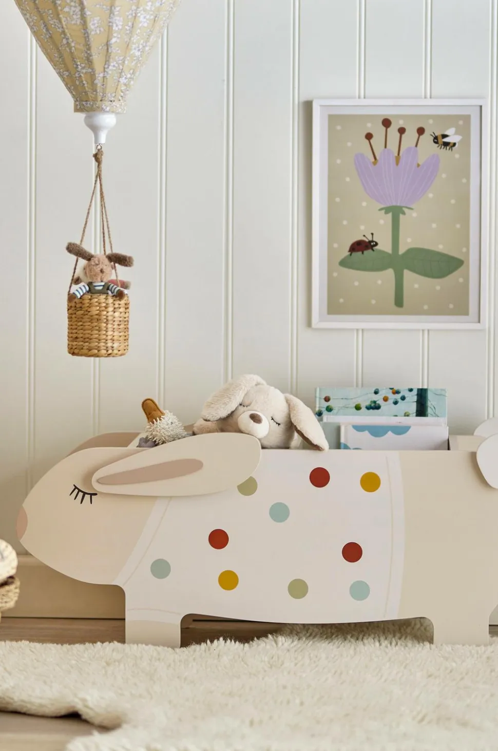 Villja-reolen fra bloomingville mini ligner en sød kanin iført en prikket sweater. Den er lavet af mdf og har hylder og rum, der er ideelle til opbevaring af bøger og legetøj på børneværelset.