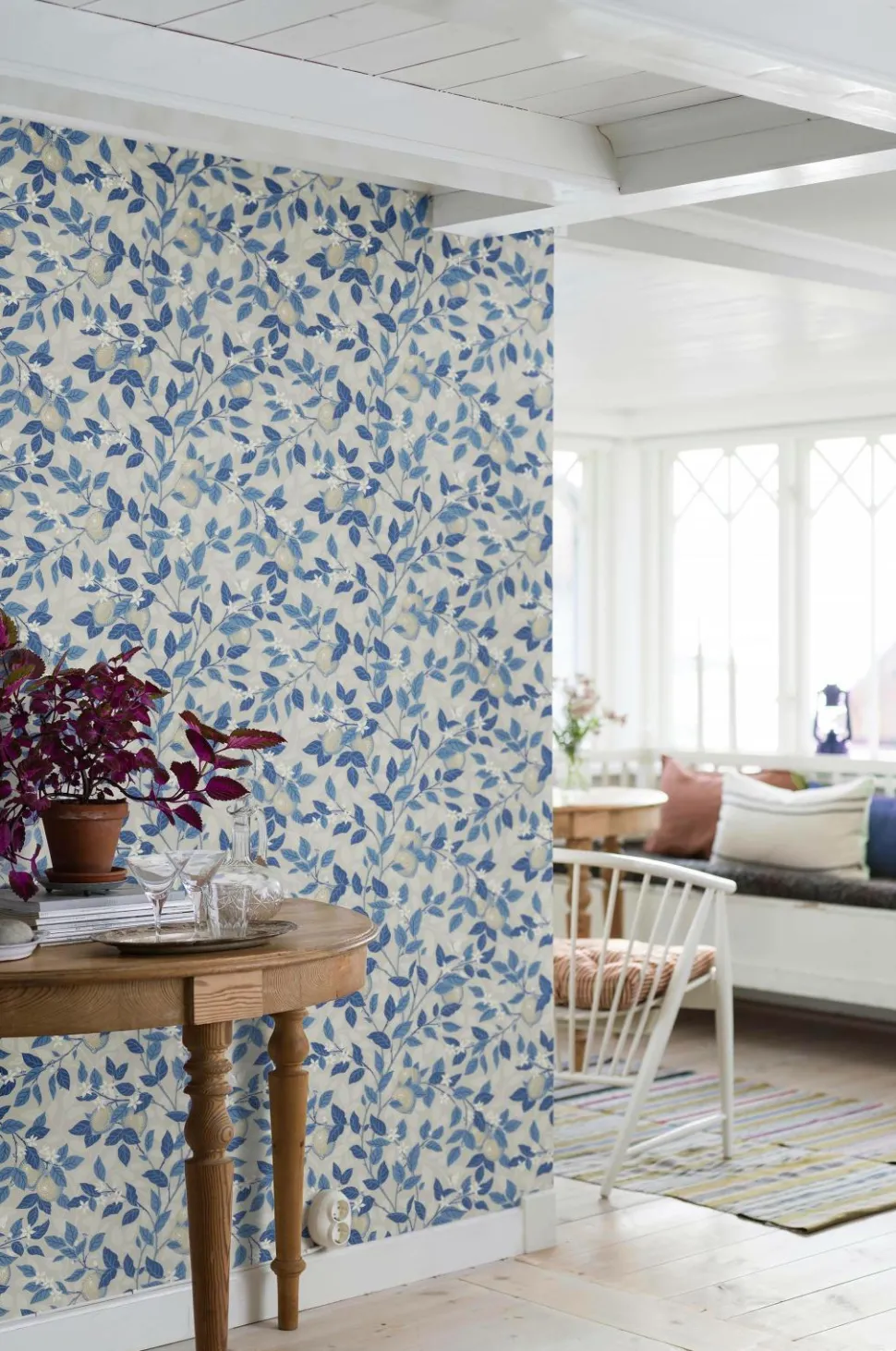Tapetet citronträd er trykt med vores traditionelle overfladetrykpresse og har en blid lys beige base med klassiske blå toner, der pryder citrontræets blade og stængler. Selve frugterne er gengivet i en blød beige nuance og passer smukt ind i en klassisk blå og hvid indretning. Dette tapet fremkalder porcelænskunstens elegance, samtidig med at det er forfriskende moderne. Ideelt til at skabe en rolig, men sofistikeret atmosfære i ethvert rum. Hver rulle er 10,05 m. Bredde 53 cm. Mønstergentagelse på 53 cm, halv drop match. Fremstillet i Sverige på et ikke-vævet materiale. Tapetet er easyup-marked, hvilket betyder, at du påfører limen direkte på væggen, og du behøver ikke at lave nogen grundmaling før.
