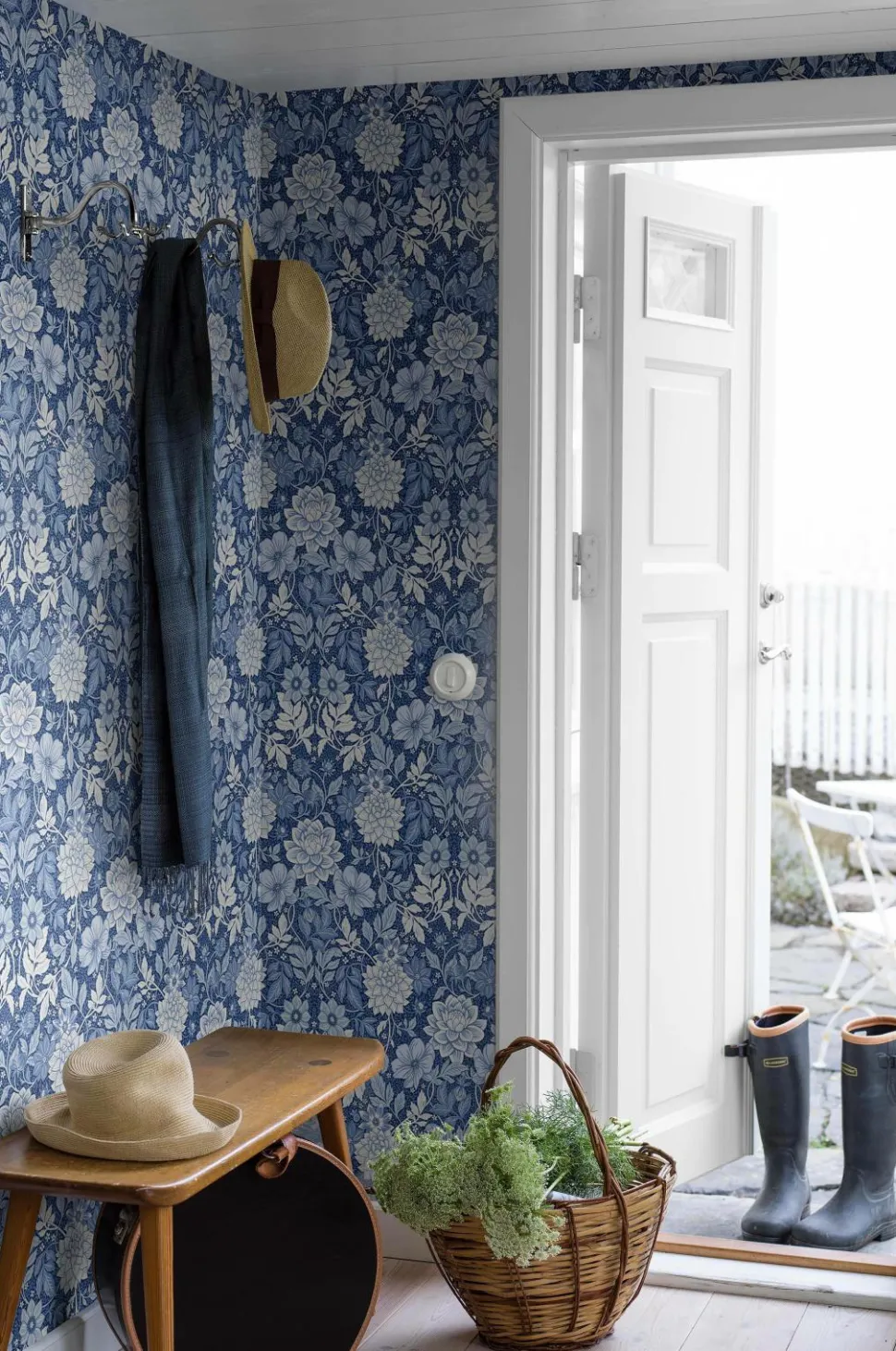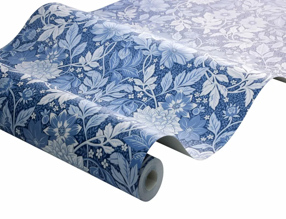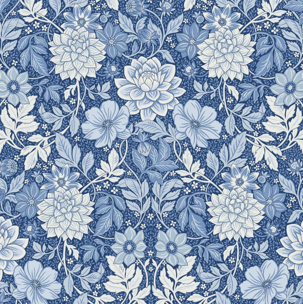 Det storblomstrede tapet Dahlia Garden er dekoreret med et snoet blomsterornament, håndmalet af designeren Jenny Hahne Gadd. En vidunderlig, arts & crafts-inspireret tapet. Hver rulle er 10,05 m. Bredde 53 cm. Lige mønsterrapport 53 cm. Printet i Sverige på et non-woven materiale. Tapetet er Easyup-mærket, hvilket betyder, at du påfører limen direkte på væggen, og du behøver ikke grunde først.