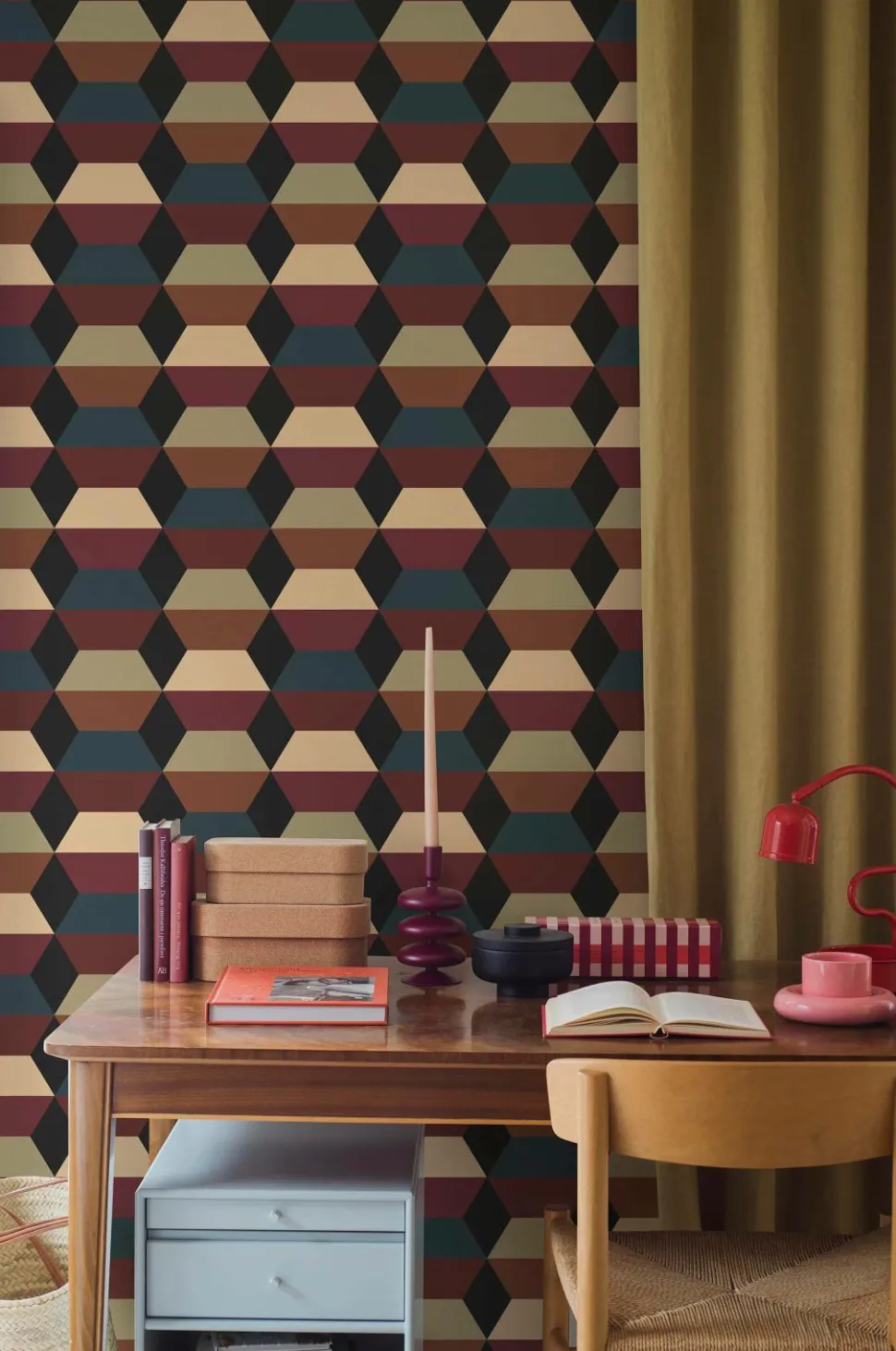 Tilføj en dynamisk og tidløs stil til dit hjem med vores prisma tapet. Med et dristigt geometrisk mønster af todelte sekskanter i flerfarvede varme og kølige toner giver dette tapet et moderne og kreativt touch til dit rum. Hæng prisma tapet op i din stue, spisestue eller køkken for at få et seriøst stilfuldt udtryk. hver rulle er 10,05 m. Bredde 53 cm. Mønstergentagelse på 53 cm, lige match. Fremstillet i Sverige på et ikke-vævet materiale. Tapetet er easyup-marked, hvilket betyder, at du påfører limen direkte på væggen, og du behøver ikke at lave nogen grundmaling før.