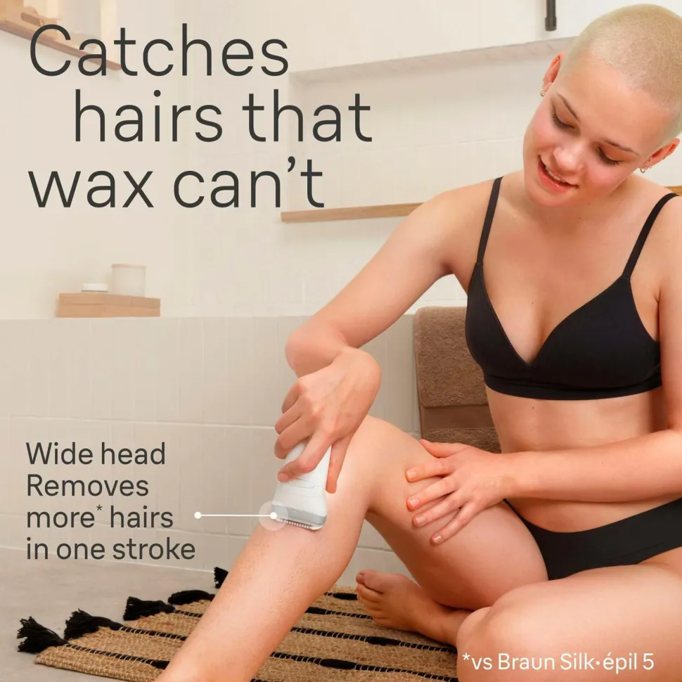 Braun Silk-épil 7 Epilator giver op til en måneds glat hud, nemt og effektivt. Dens brede hoved dækker større områder og fanger flere hår i hvert strøg end Braun Silk-épil 5. Udstyret med MicroGrip-pincetteknologi fjerner den hår helt ned til 0,5 mm og giver salonglatte resultater med ekstra komfort takket være massagerullerne, som hjælper med at reducere smerter. Brug den våd eller tør, hvilket gør epilering mere behagelig i badet eller under bruseren. Den er bygget til at holde og har et barberhoved til damer og en trimmerkam til følsomme områder. Denne epilator eliminerer behovet for salonbesøg eller for at vente på, at håret vokser ud igen.