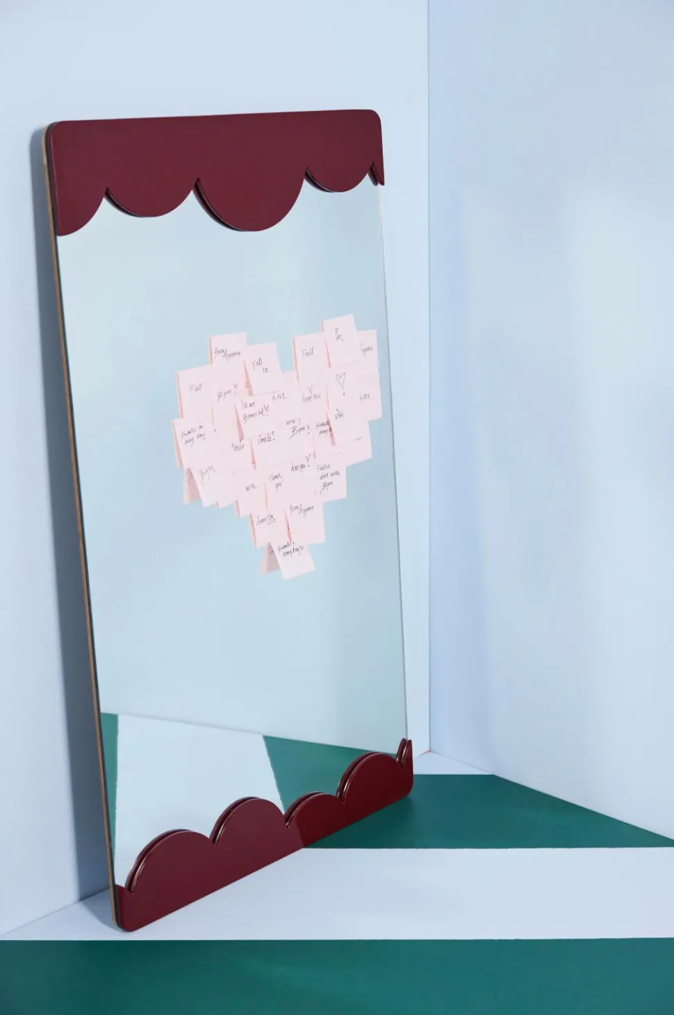 De bløde, afrundede former er tegnet i hånden og skaber legende halvcirkler, der får os til at tænke på luftige skyer. Rammen har et anderledes design, hvor den ikke sidder på den klassiske måde med fire sider, men kun på to af siderne. Rammen er lavet af sprøjtelakeret MDF og har to forskellige ophæng (vandret og lodret) for at kunne variere den måde, den hænges op på. Et spejl, vi absolut vil se i mange hjem for at lyse op i et rum. Fås i beige og bordeaux. Design Byon Studio.