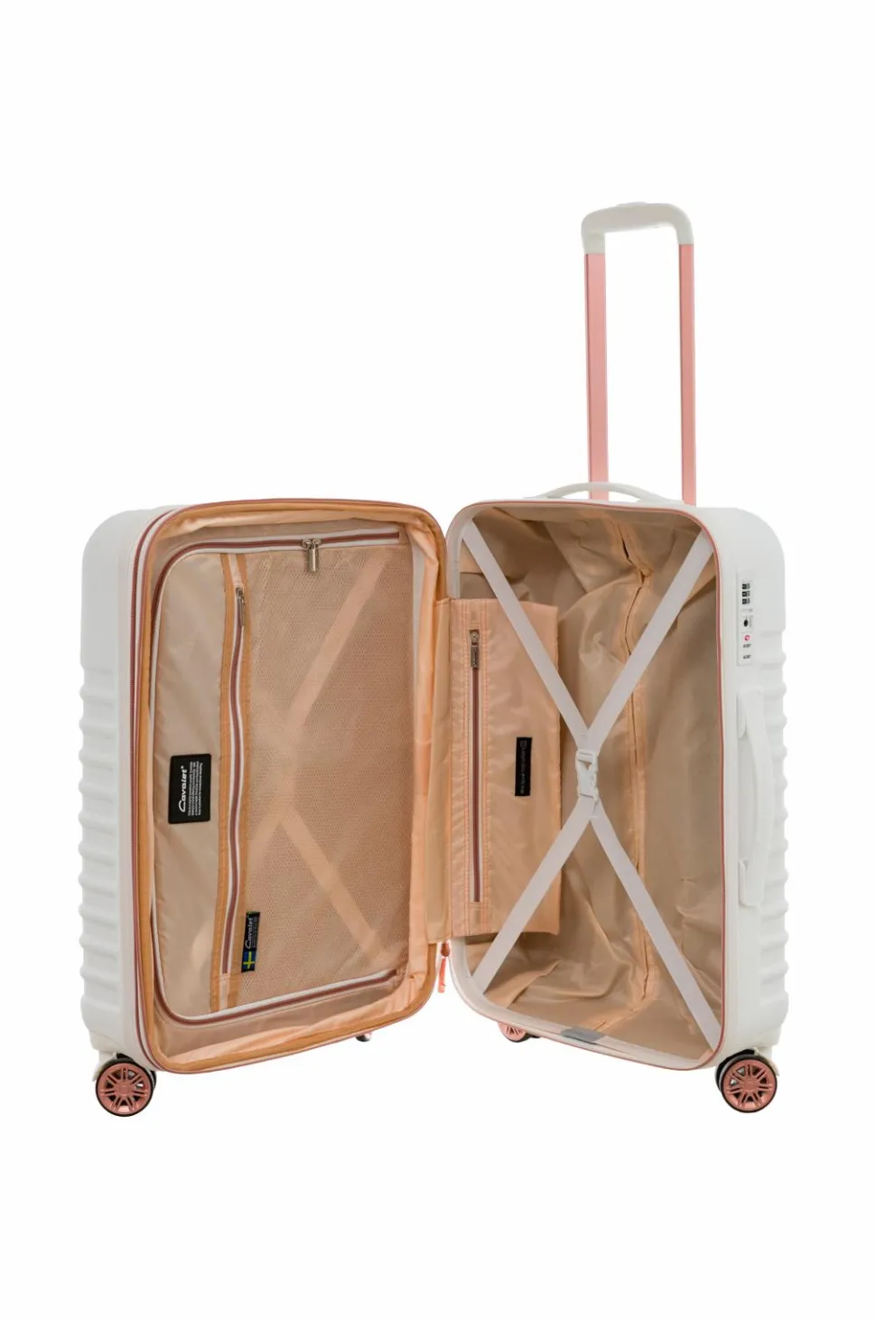 Dobbelthjul gør den stabil og nem at manøvrere og et interiør, der følger taskens udvendige farvekombinationer.