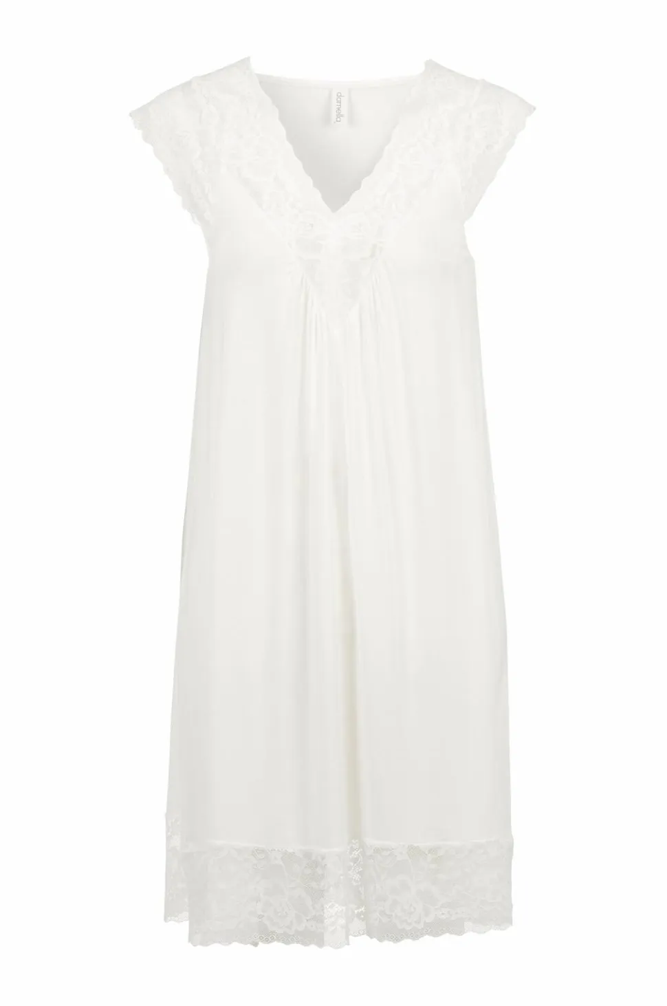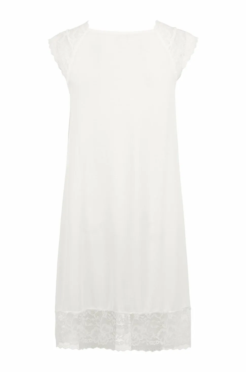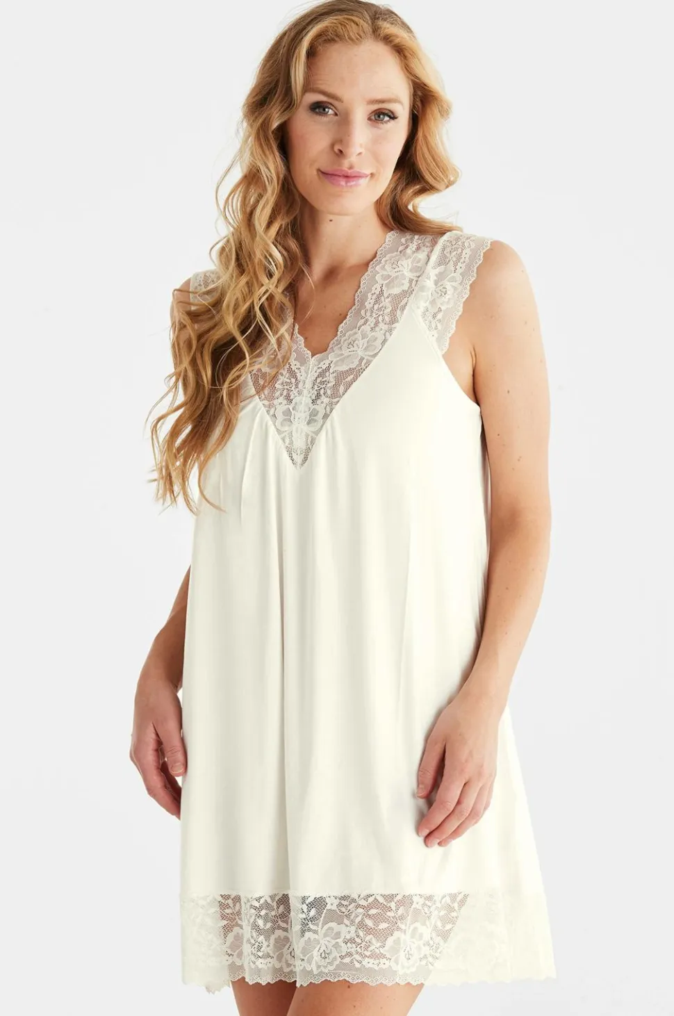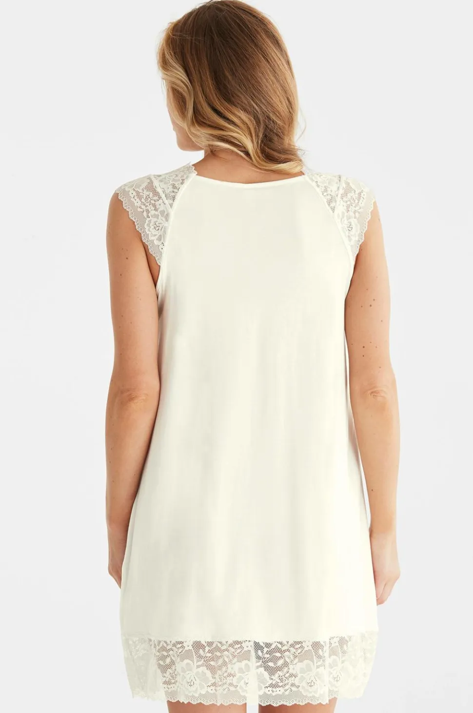 Ærmeløs natkjole med en elegant V-formet blondedetalje ved halsen og blonder rundt om forneden. Viskosestoffet giver en glat pasform, der rammer den perfekte balance mellem elegance og komfort.