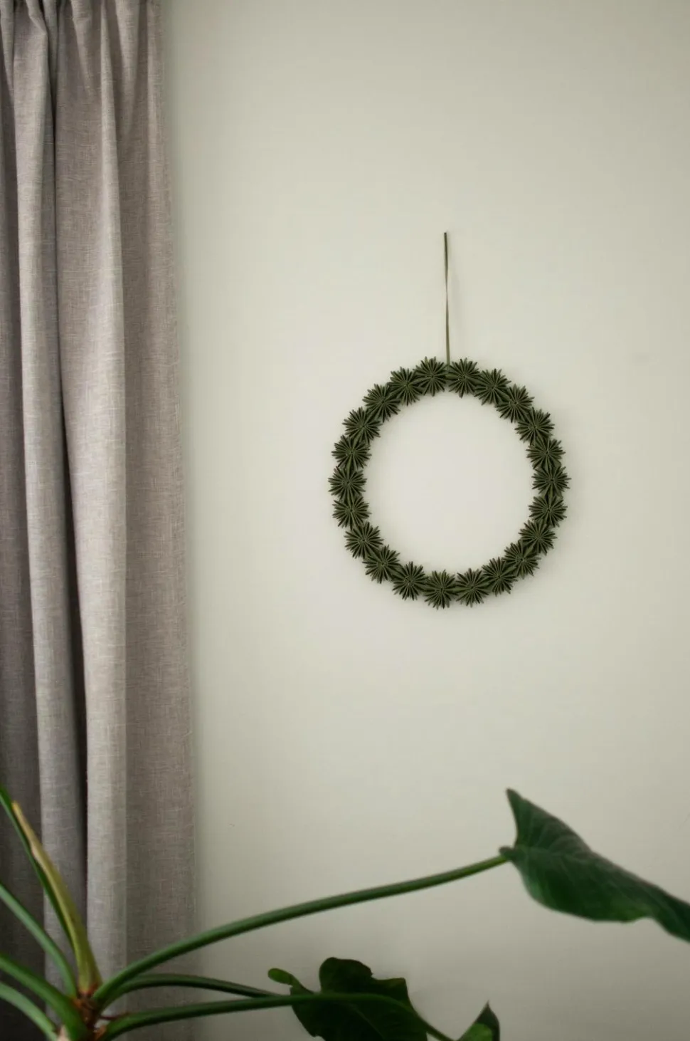 Denne krans lavet af papir giver en illusion af en minimalistisk krans lavet af kviste. Den vil forblive grøn år efter år. Ø35 cm.