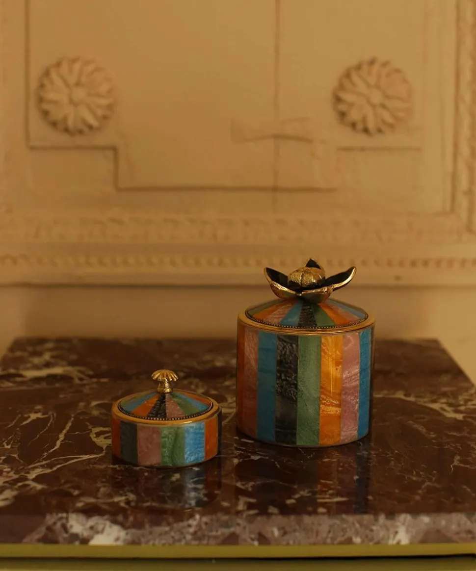 Tilføj et strejf af livlig charme til dit interiør med Liv Circus Box Large Multi. Denne iøjnefaldende opbevaringsboks er håndlavet af en blanding af 60 % messing og 40 % harpiks. Det farverige stribede design og det markante blomsterformede låg gør den både dekorativ og funktionel – et ægte blikfang på enhver hylde, kommode eller skrivebord. Uanset om du vil opbevare smykker, nipsgenstande eller små minder, er denne store dekorative kasse den perfekte løsning. Den flerfarvede finish blander rige nuancer af blå, grøn, lyserød, gul og sort i legesyge lodrette striber, der bringer liv til ethvert rum. Den håndstøbte blomst på låget fungerer som et skulpturelt håndtag, der tilføjer både elegance og fantasi. Brug Liv Circus Box som smykkeskrin, opbevaringsbeholder eller opbevaringsplads til små personlige skatte. Den er især ideel til soveværelser, badeværelser eller stuer, hvor du ønsker at holde dine ting organiserede og samtidig smukt udstillet. Bemærk: Dette produkt er ikke fødevaregodkendt og bør ikke bruges til opbevaring af spiselige produkter. Hver kasse er håndlavet i Indien, hvilket sikrer, at hvert stykke har sine egne unikke variationer og håndværksmæssige charme. Kombinationen af genbrugsmessing og harpiks gør det til et bæredygtigt og stilfuldt supplement til din boligindretning.