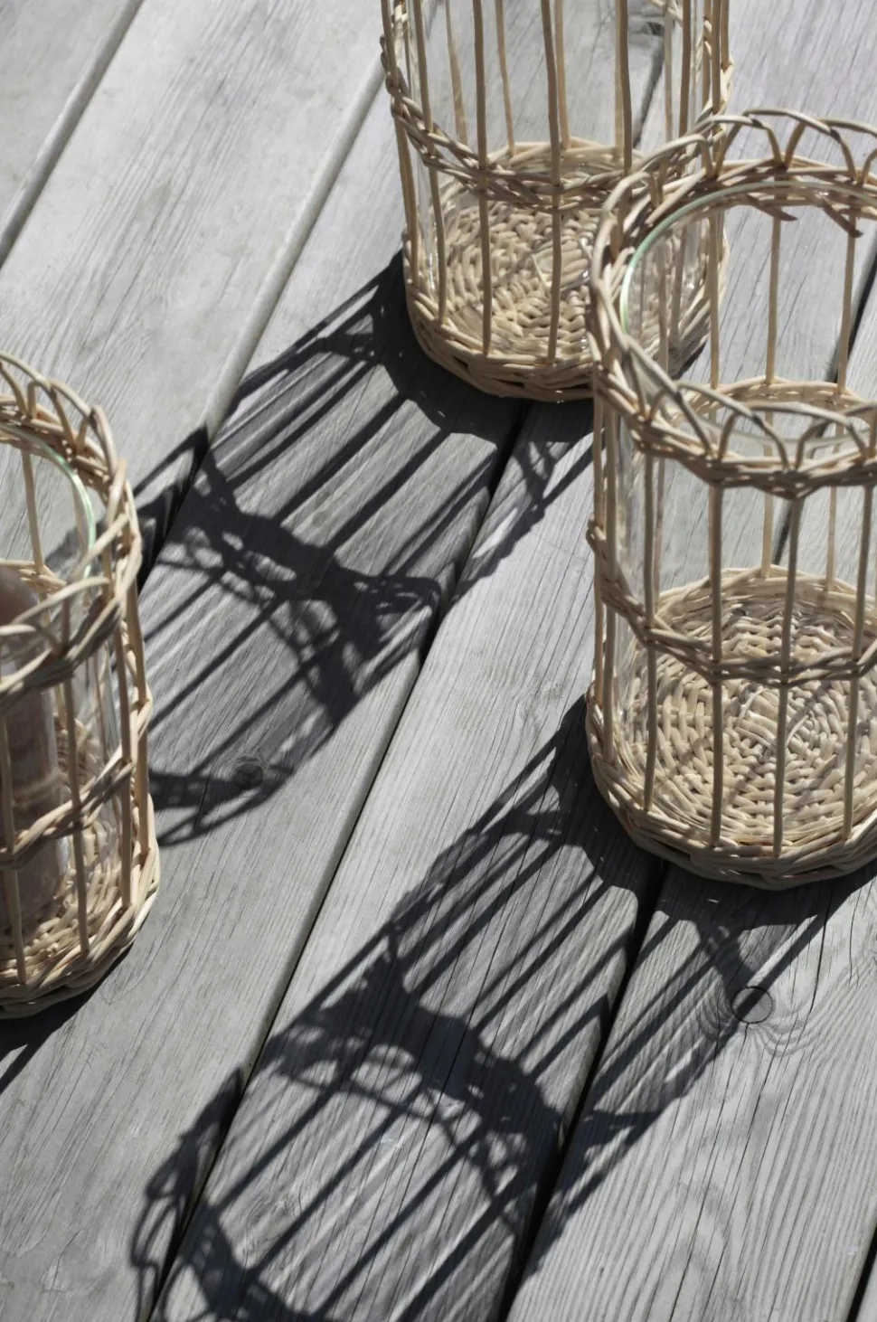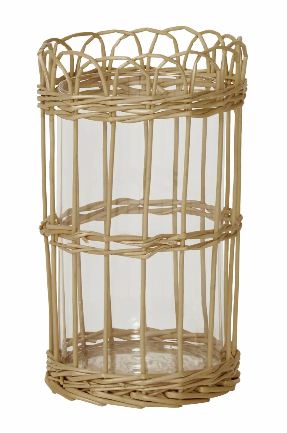 Håndlavet lanterne i rattan med tilhørende glascylinder, højde 25 cm. Kan også bruges som en vase. Tørres med en fugtig klud.