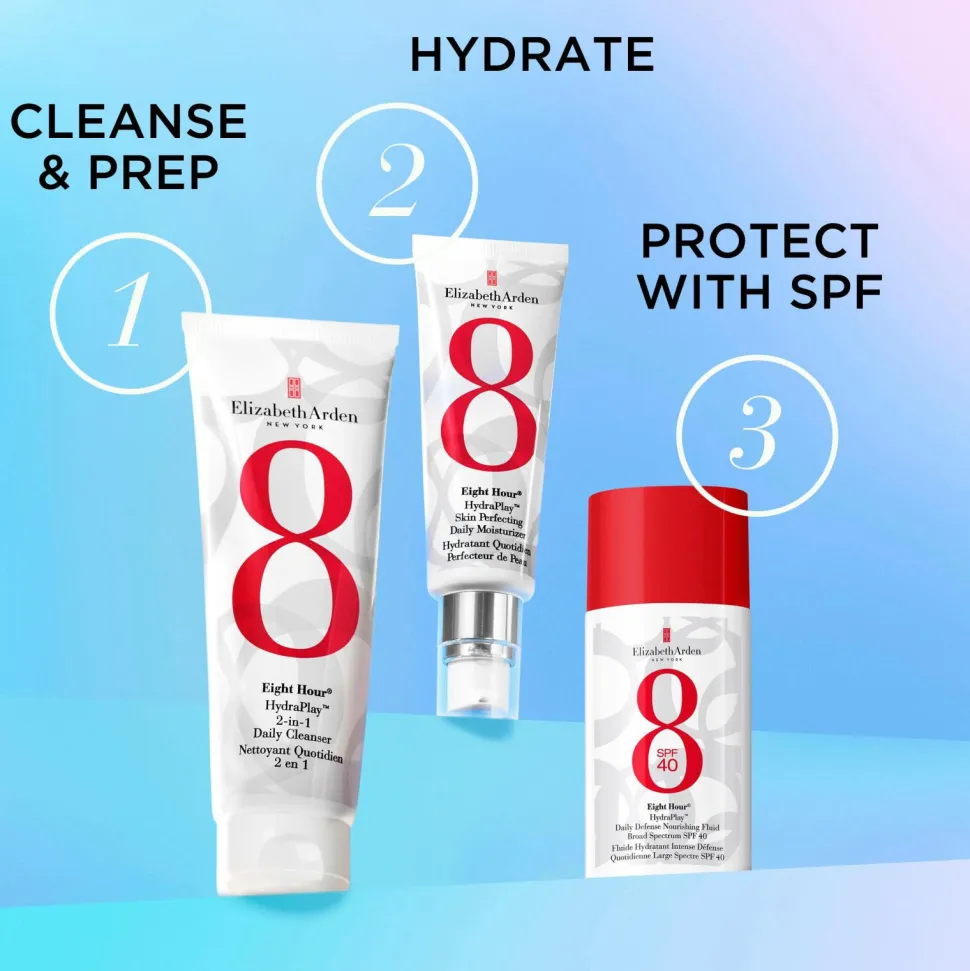 New HydraPlay™ Daily Defense Nourishing Fluid Broad Spectrum Spf 40 fra den ikoniske Eight Hour®-kollektion giver usynlig beskyttelse mod miljøforurenende stoffer, blåt lys og Uva/Uvb stråler. Med antioxidanter, botanisk skjold og sukkerroeekstrakt hjælper den med at forsvare huden mod de aldrende virkninger af disse aggressorer, som kan føre til skader fra frie radikaler. Formlen er designet til at øge hydreringen og efterlader huden glat, strålende og smidig. Den er let, parfumefri og vegansk, efterlader ingen hvide plamager eller fedtede rester og føles behagelig på huden. Ikke komedogen. Skånsom nok til alle hudtyper.