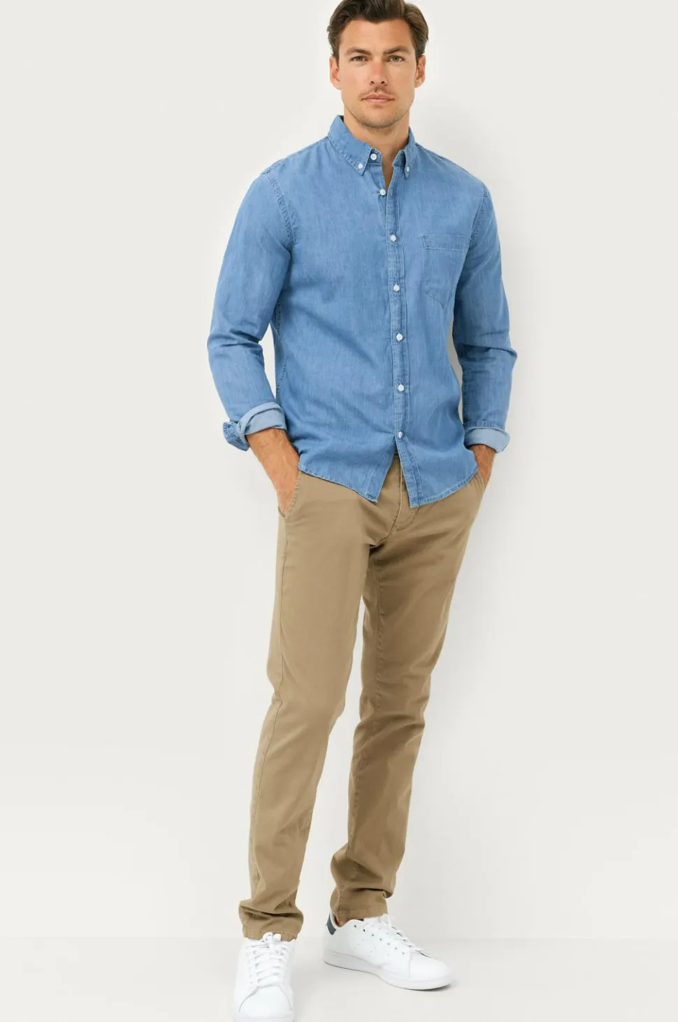 Chinos i bomuldsstretch. Linning med stropper, knap og gylp med lynlås. Tre lommer foran og to indsatte baglommer med knap. Benlængde ca. 81 cm i str. 50.