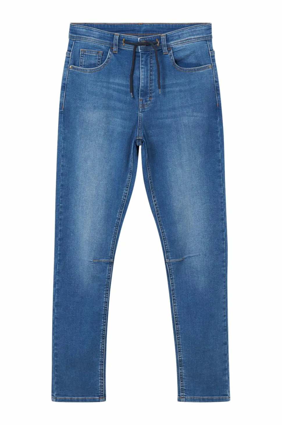 Denimjoggers i blød, skøn stretchkvalitet. 5-lommemodel med lynlåsgylp og justerbar løbegang i taljen. Syede læg ved knæene og let smal pasform.