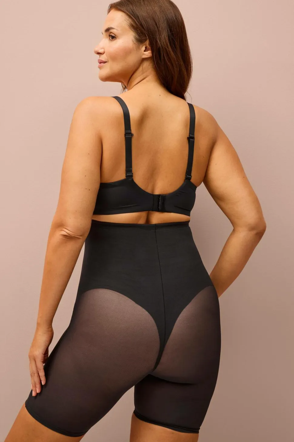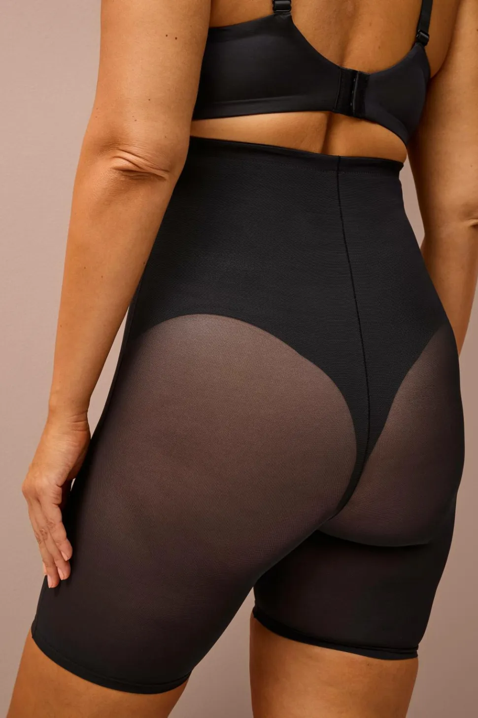 Shaping-shorts med høj talje og indvendig silikoneelastik, der holder dem på plads. Den har en formende, fastere støtte over taljen, maven, bagdelen, lårene og numsen. Konstrueret med minimale sømme for en sømløs, behagelig fornemmelse mod huden.