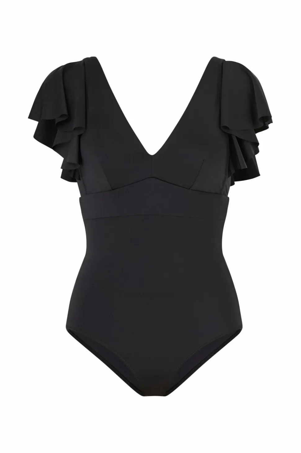 • Foret badedragt i elastisk polyamid-blanding med flæsedesign omkring ærmeåbningerne