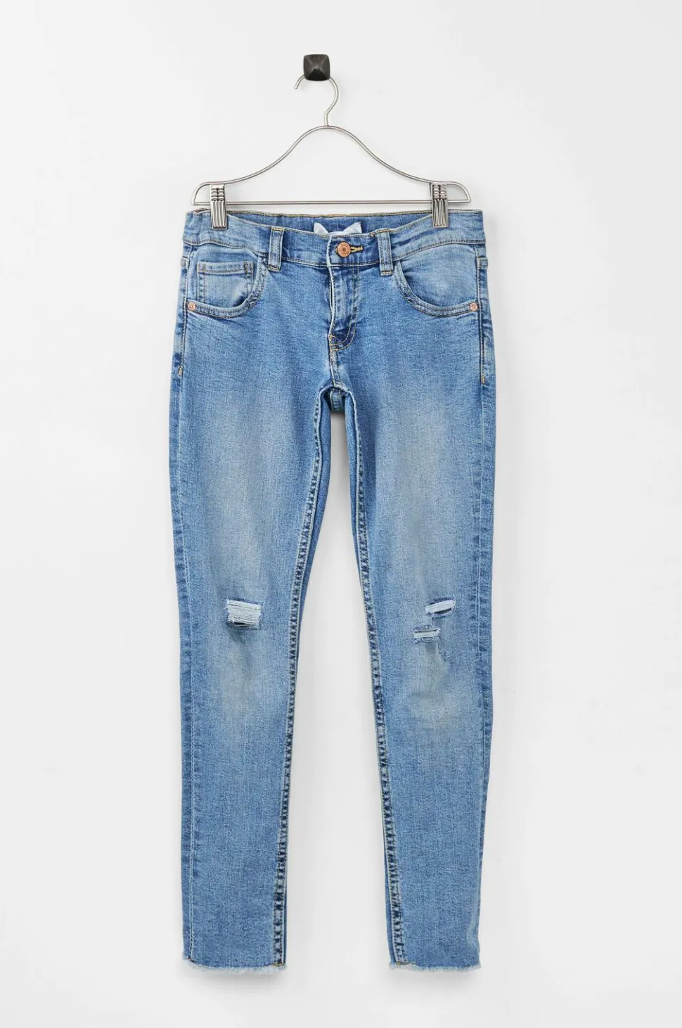 Jeans i stretchdenim. 5-lommemodel. Linning med trykknap i str. 134-146 og almindelig knap i str. 152-164. Gylp med lynlås. Regulerbar taljevidde med indvendig knaphulselastik. “Snydehul” på knæene med stof bagpå og rå kanter i benene.