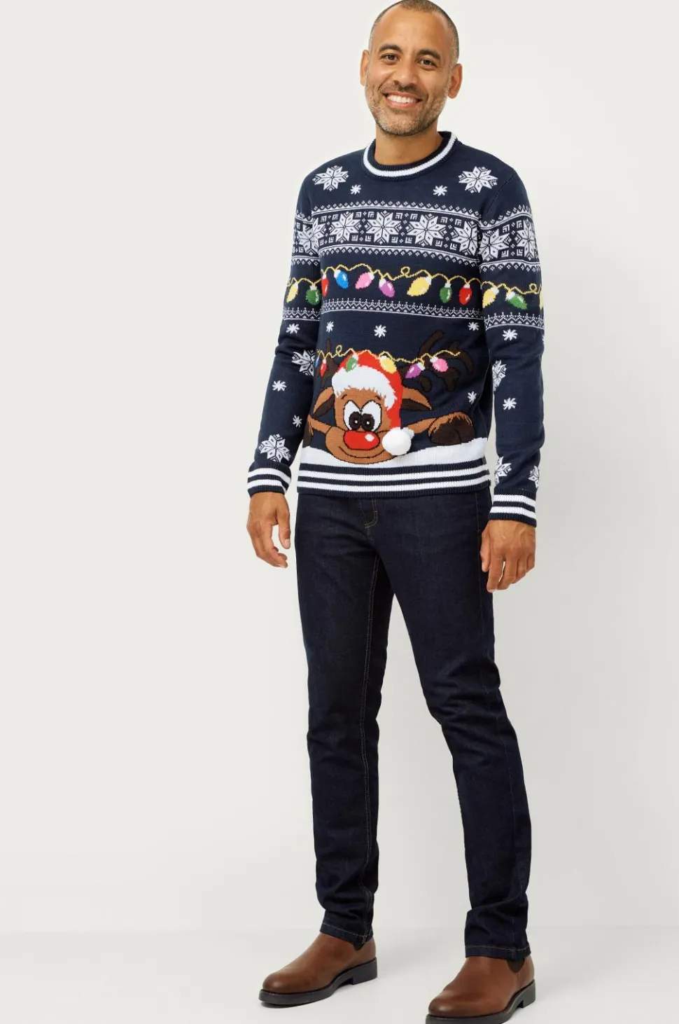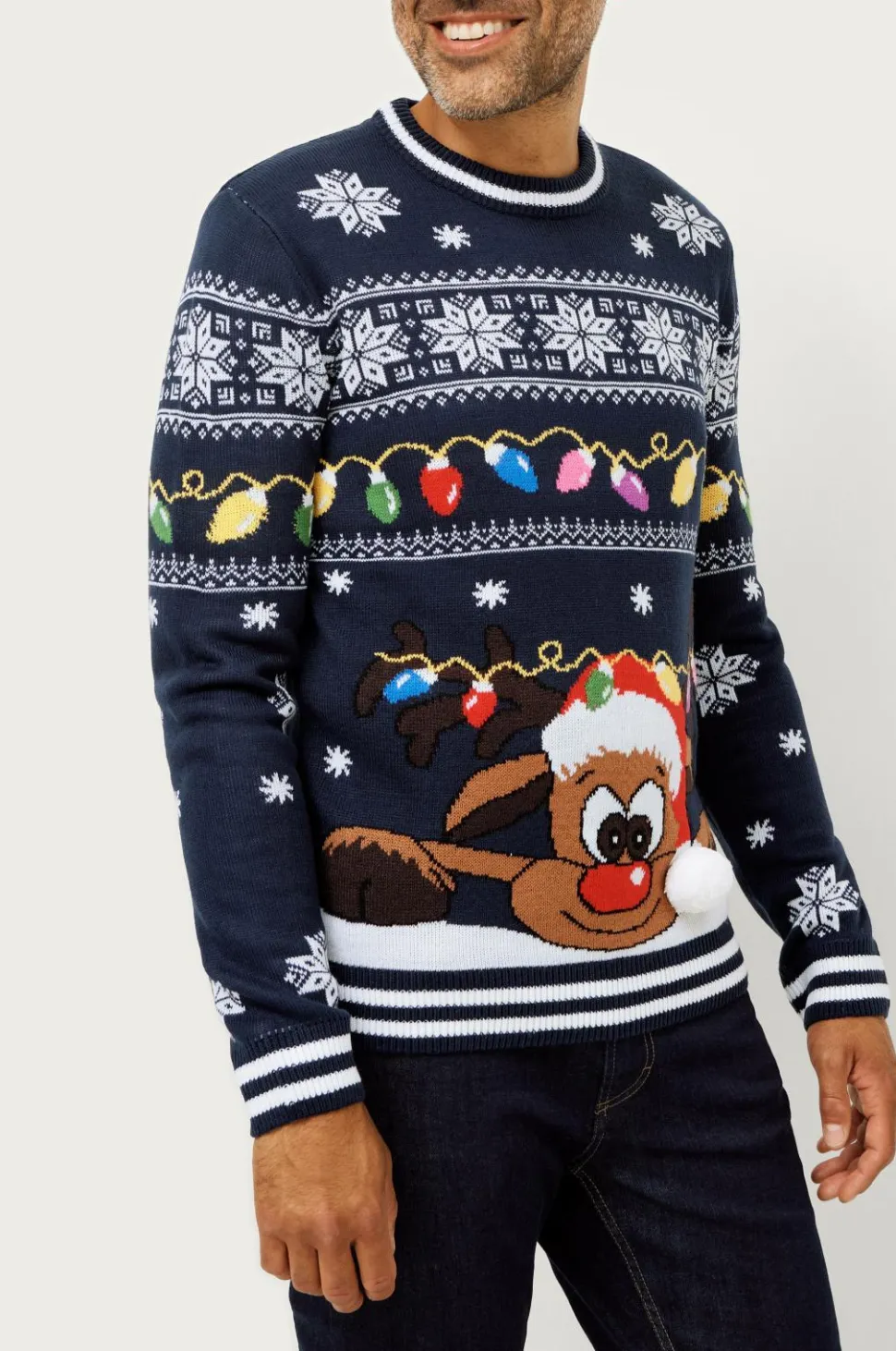 Juletrøje i glatstrikket model med fin mønsterstrik og applikationer. Lige design med rund halsudskæring, som har ribstrikket kant. Også ribstrik i kanten forneden og ærmekanten. Længde ca. 81 cm i str. M.