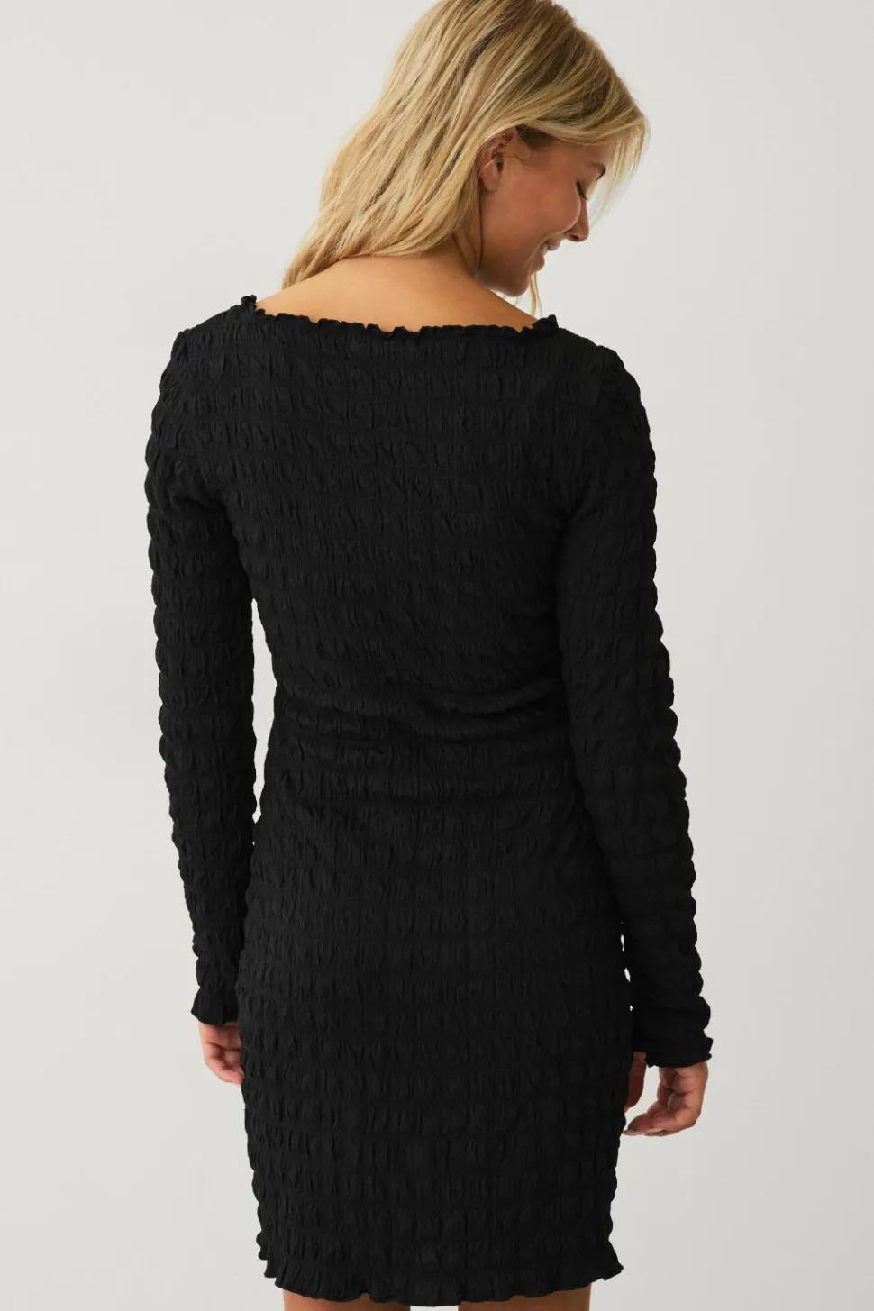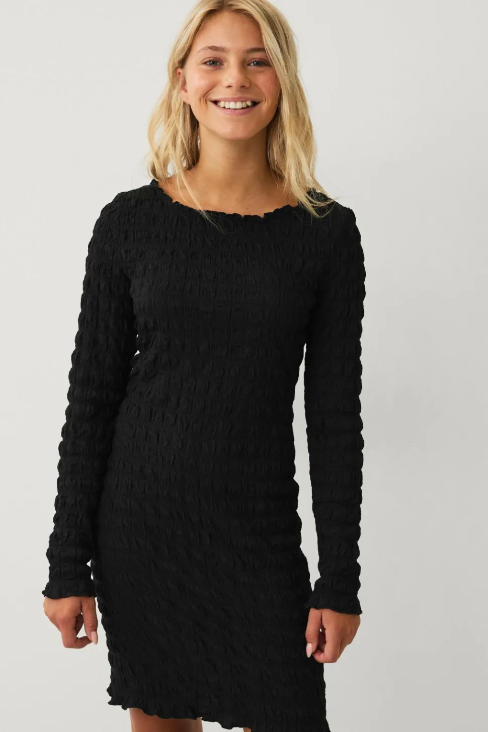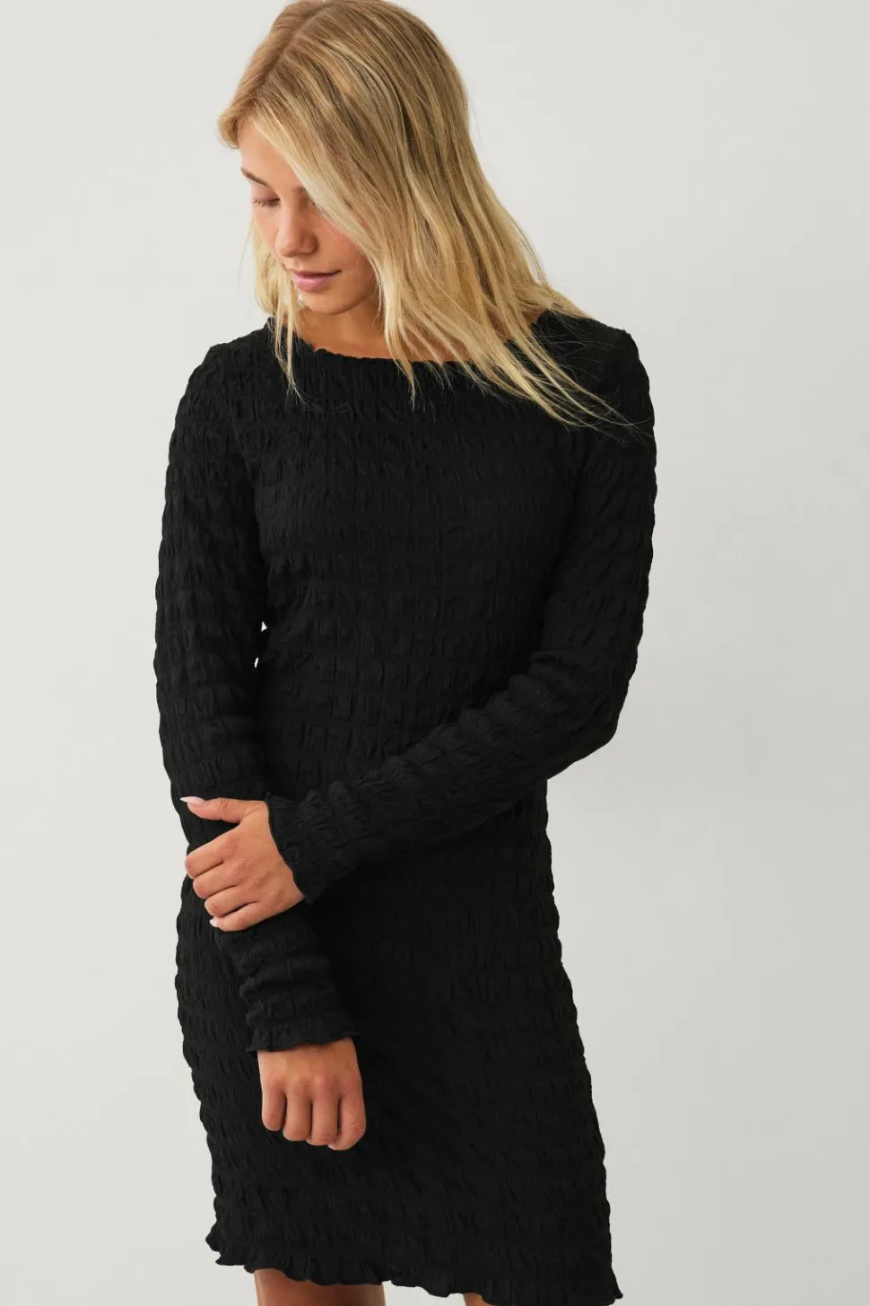 • Langærmet, figursyet kjole med smock