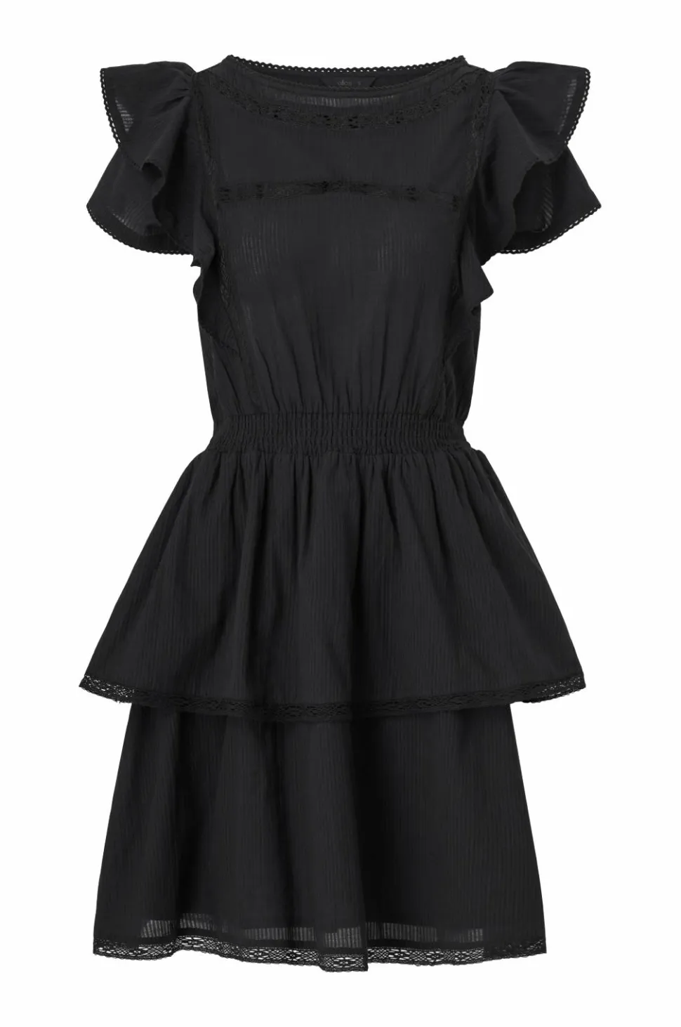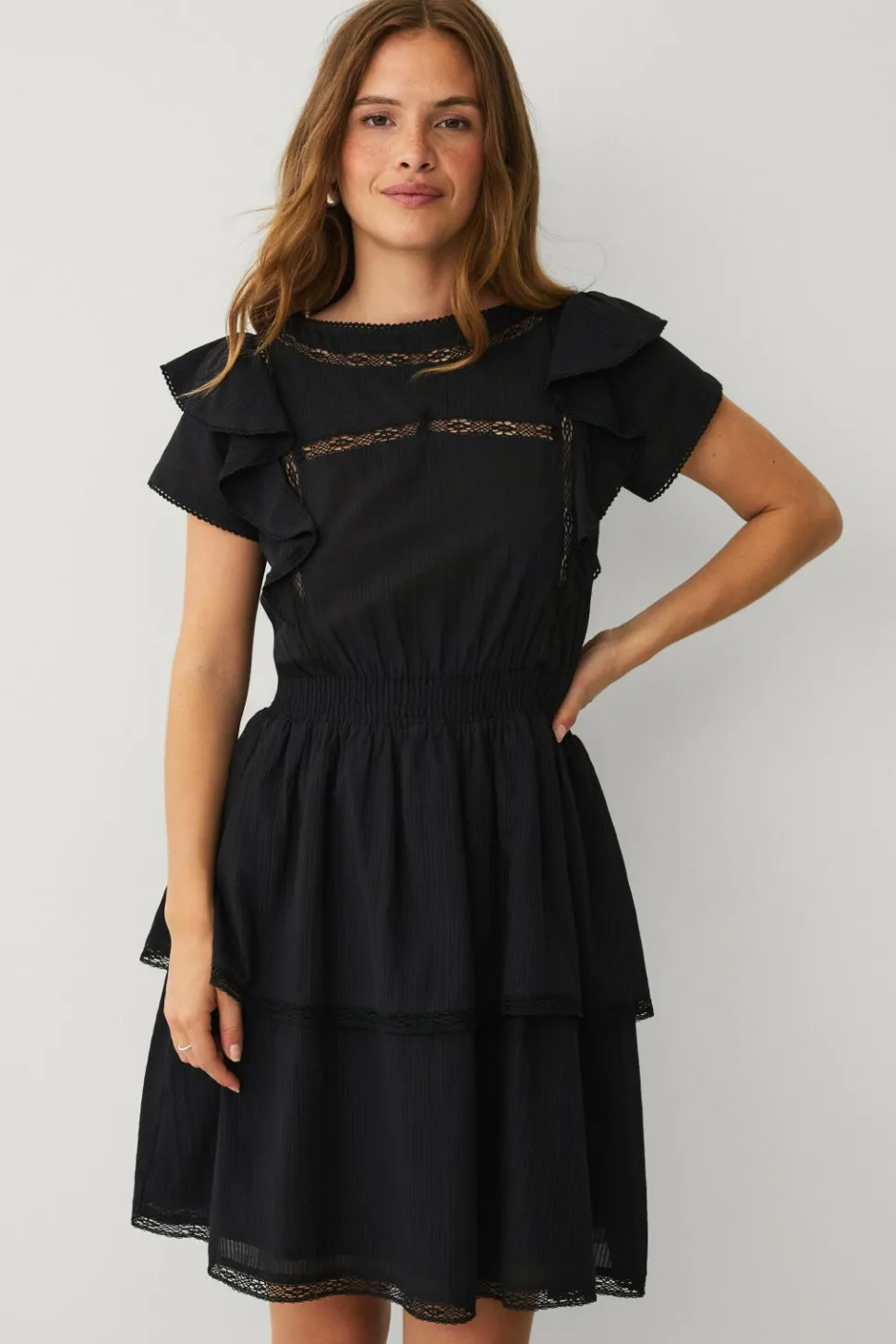 • Kjole med blondedetaljer og volanter