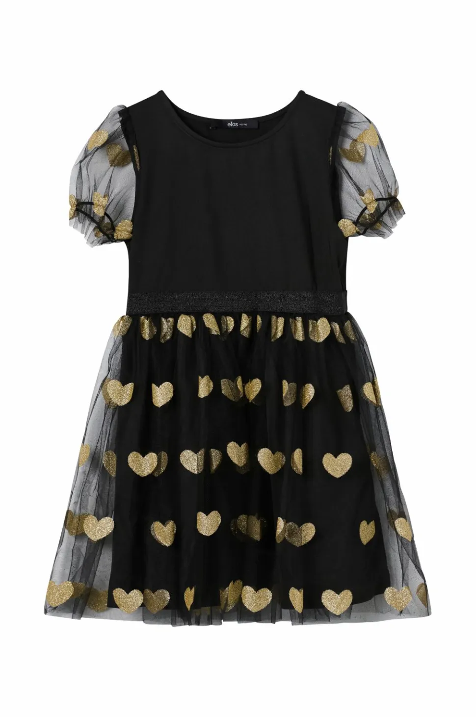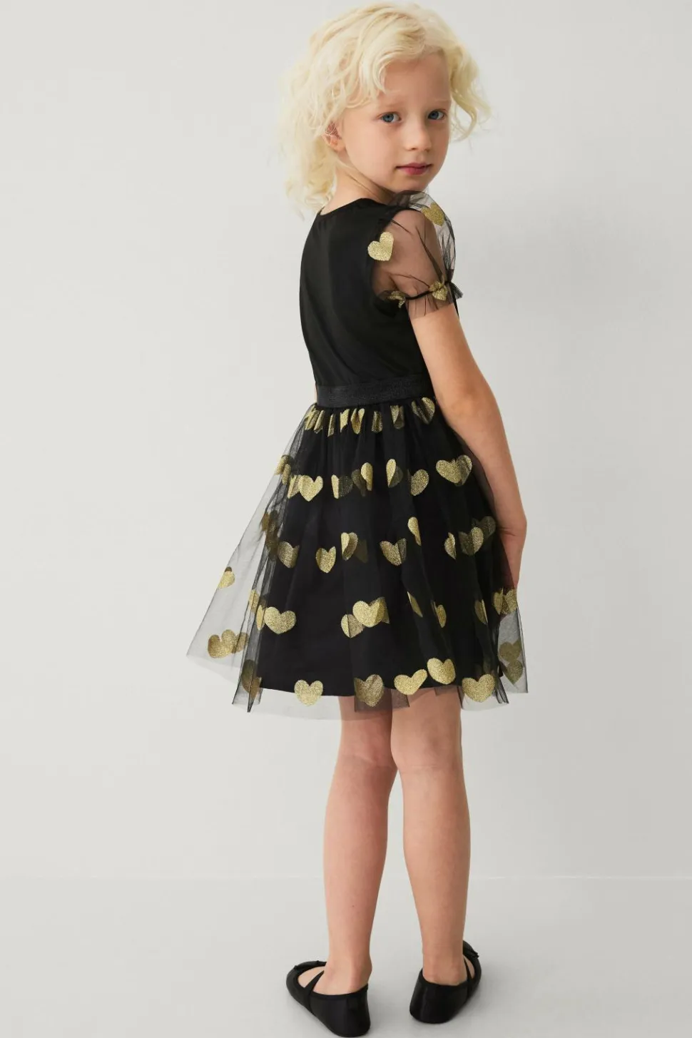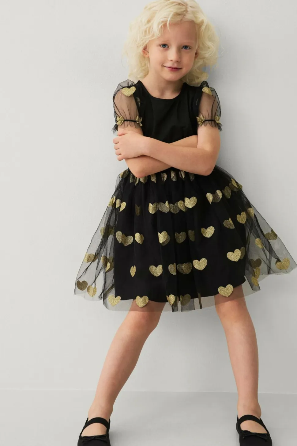 • Guldfarvede hjertemønstre på skørtet og på ærmerne