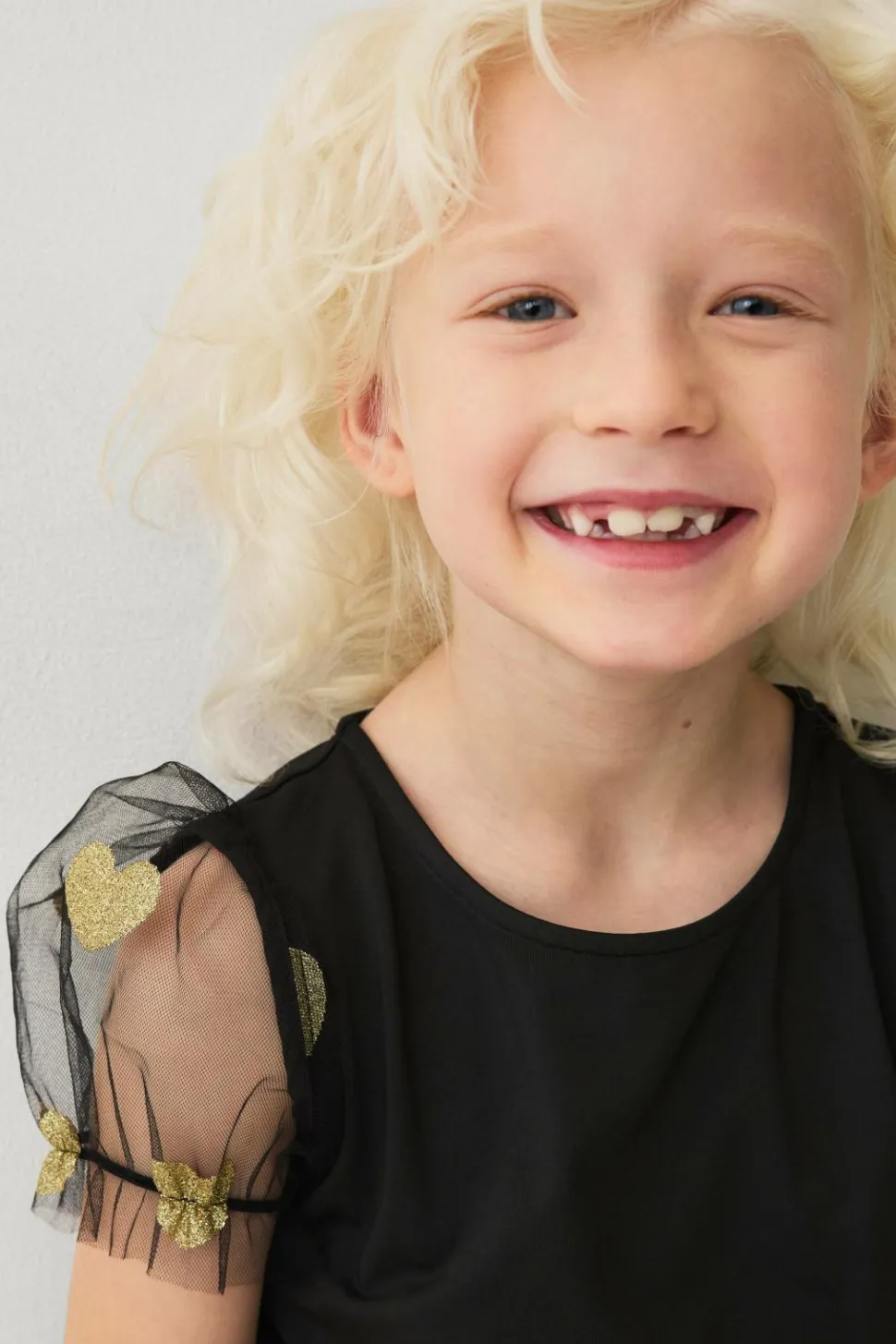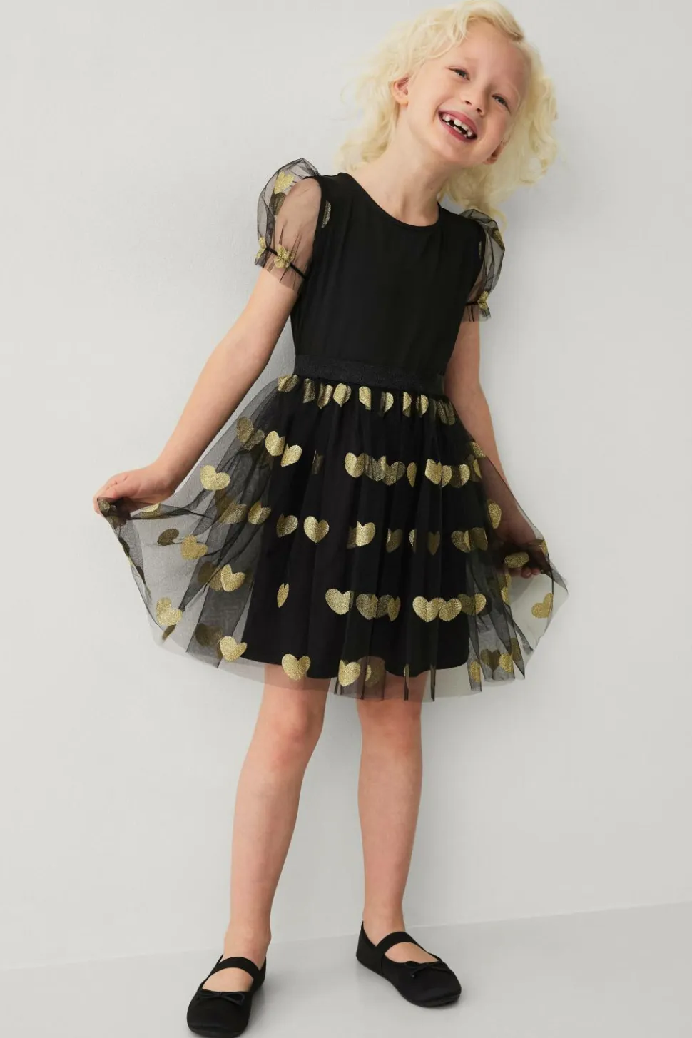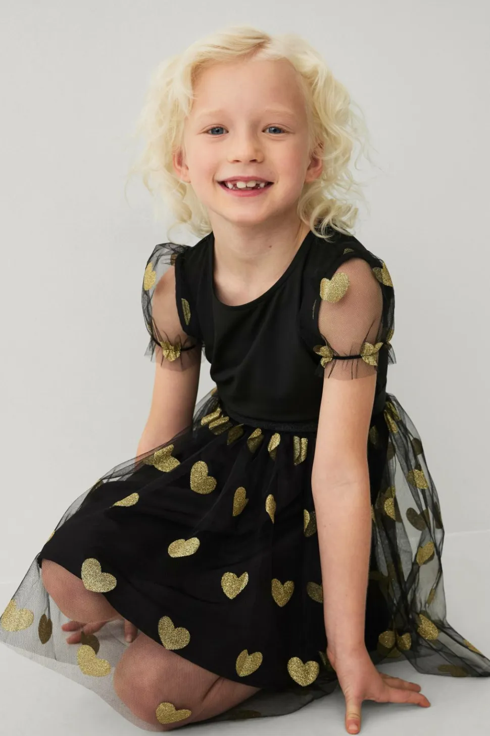 • Guldfarvede hjertemønstre på skørtet og på ærmerne