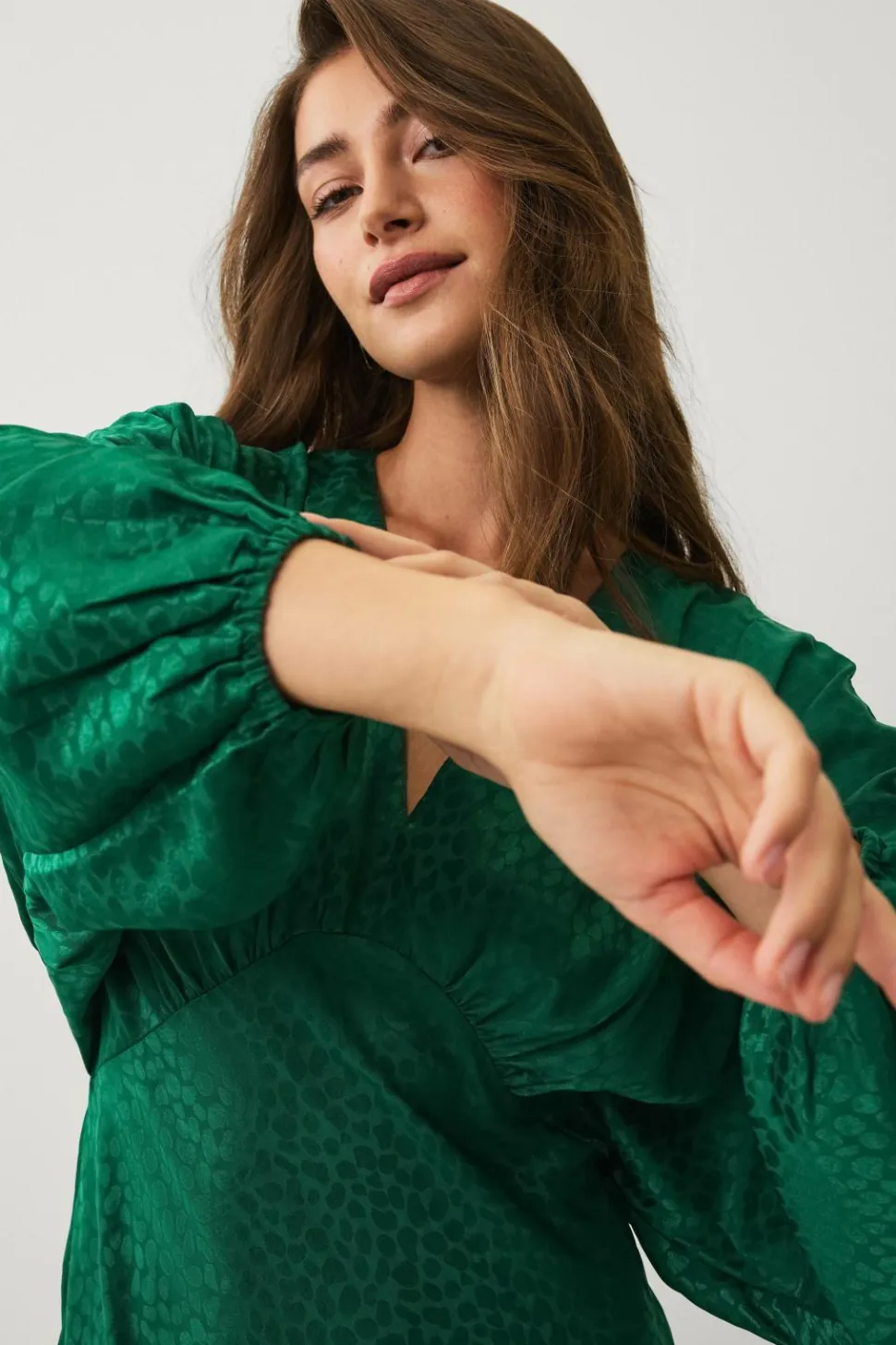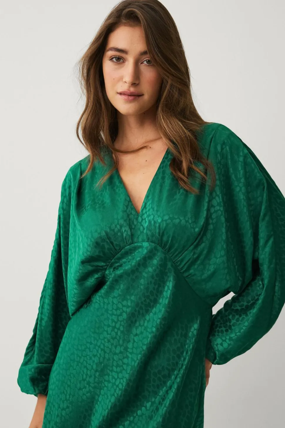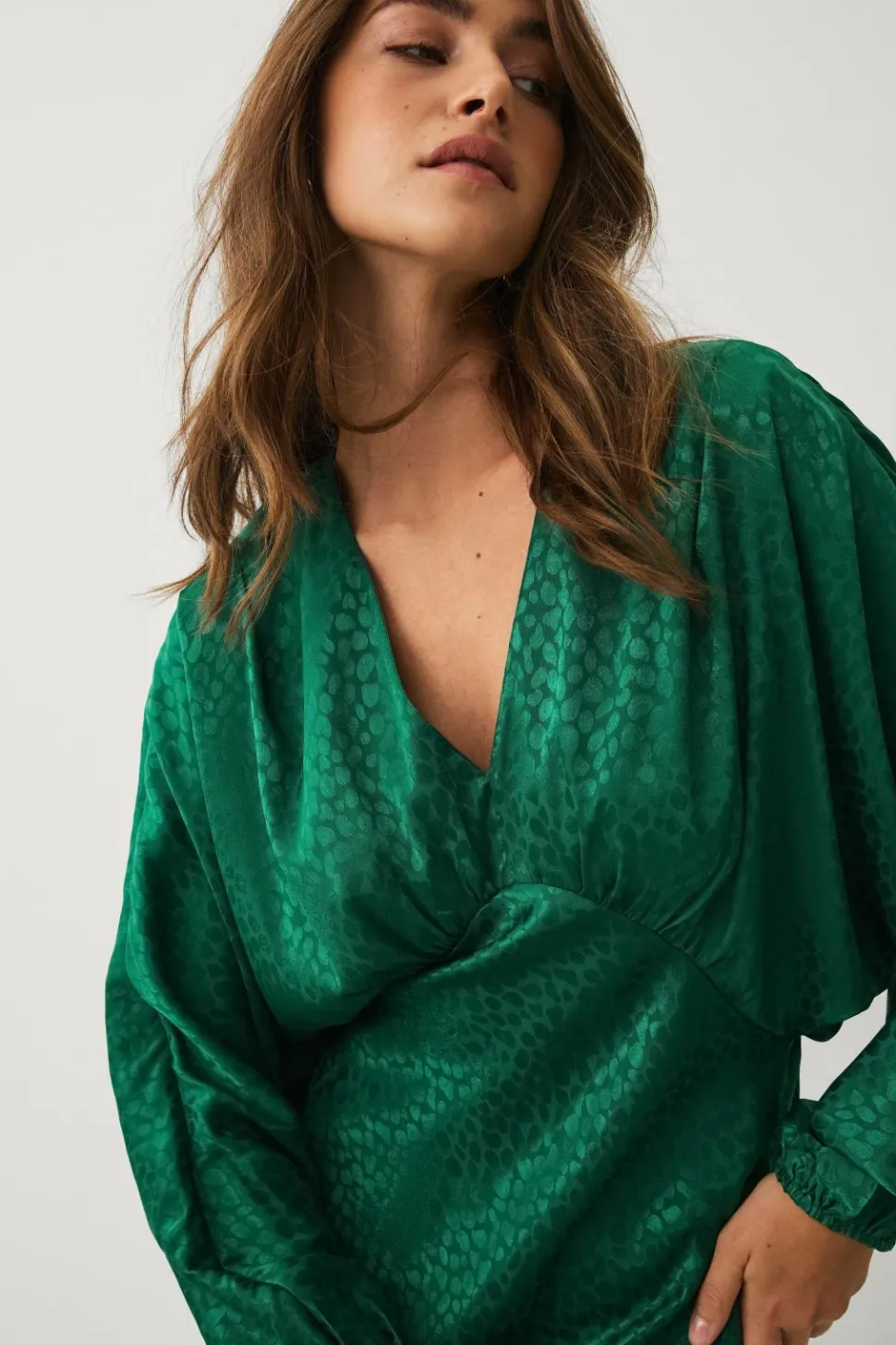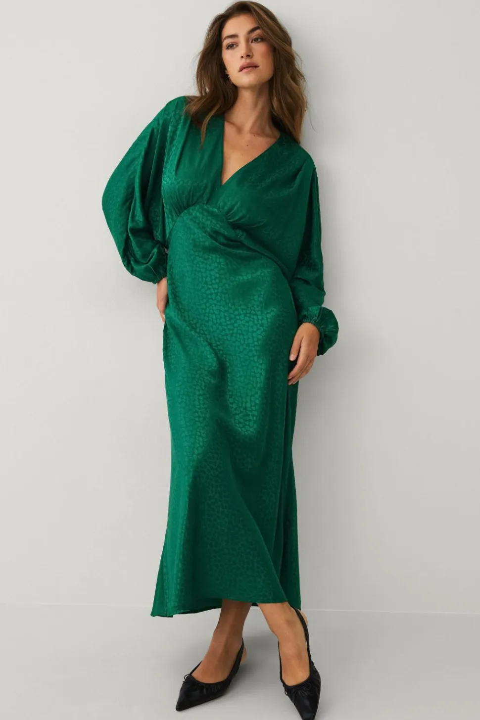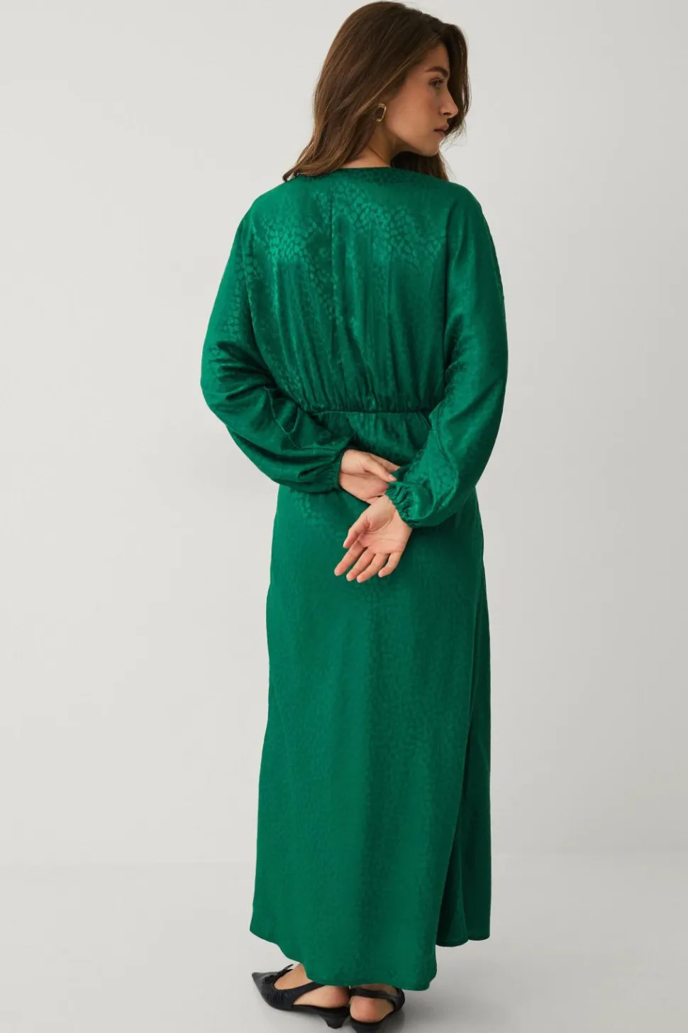 • Lang kjole i satin med strukturmønster