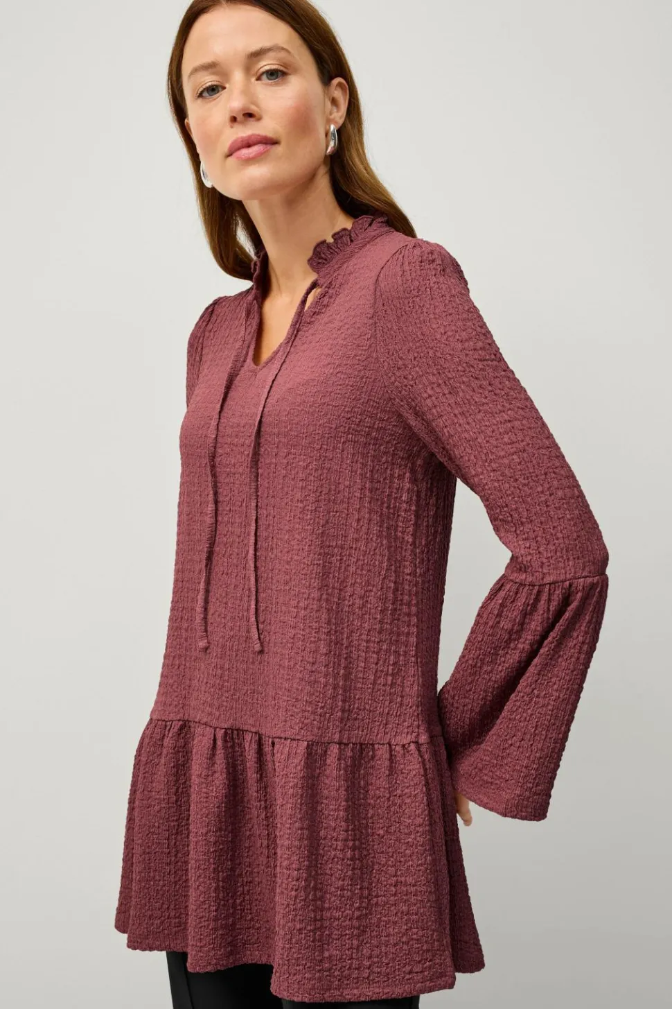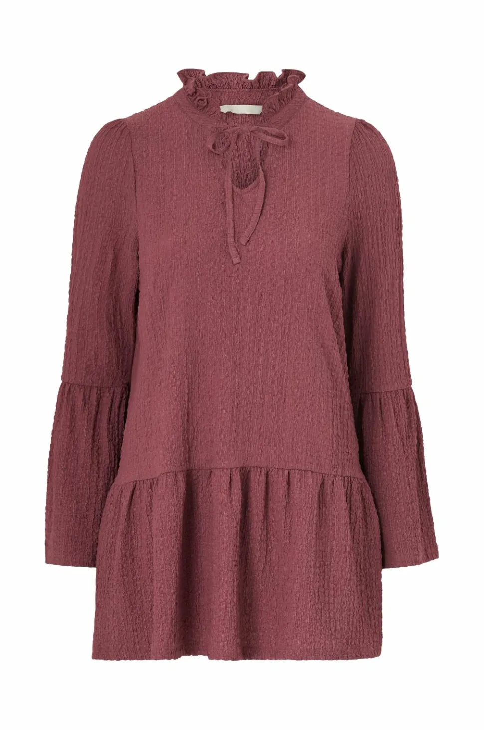 • Rund hals med volant og bindebånd foran