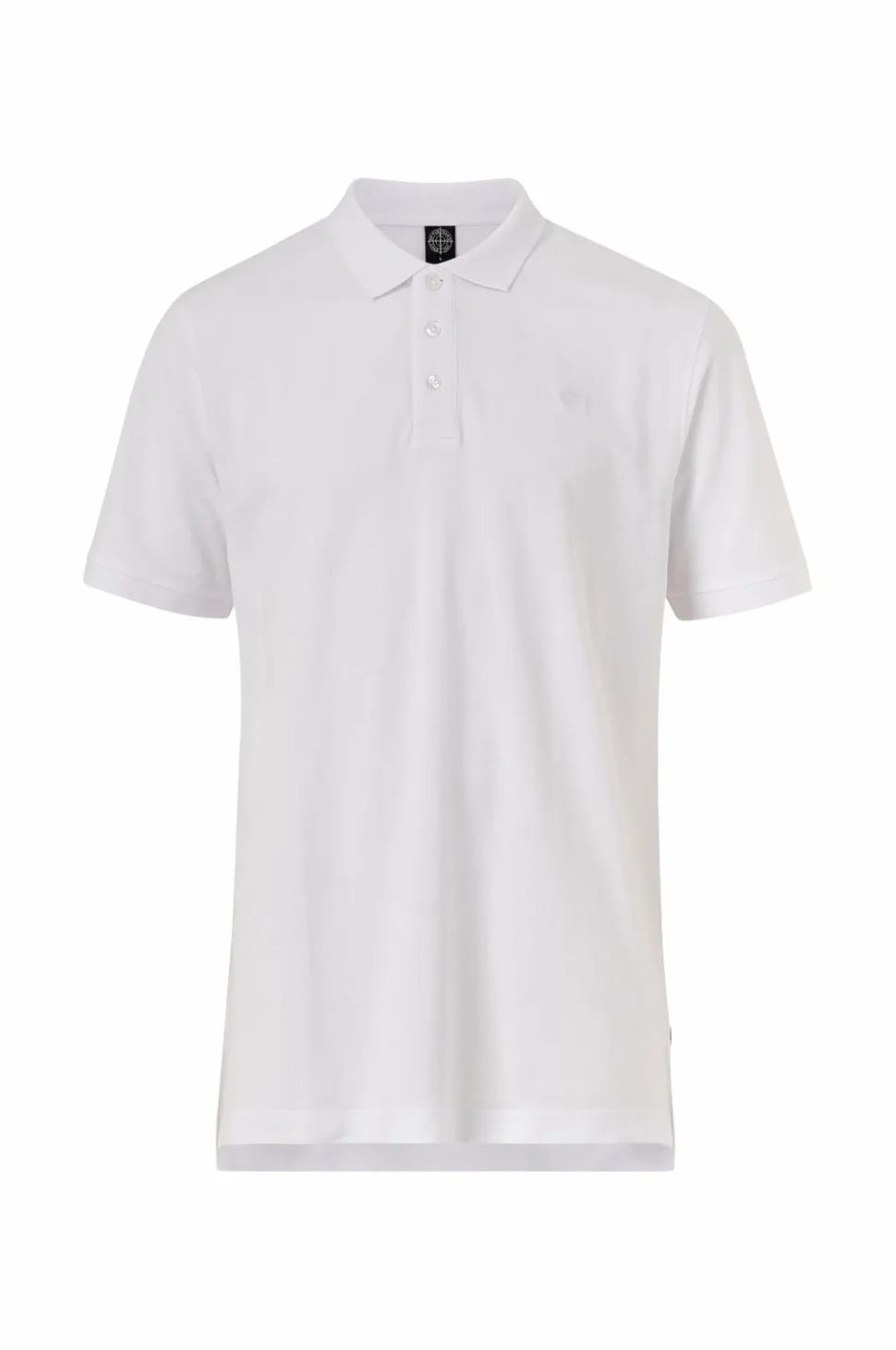 Poloshirt Clark fra On Our Terms i klassisk model med krave i rib og stolpelukning med tre knapper. Ribkanter i ærmerne og lille broderi på brystet. Slids i siderne og noget længere bagpå.