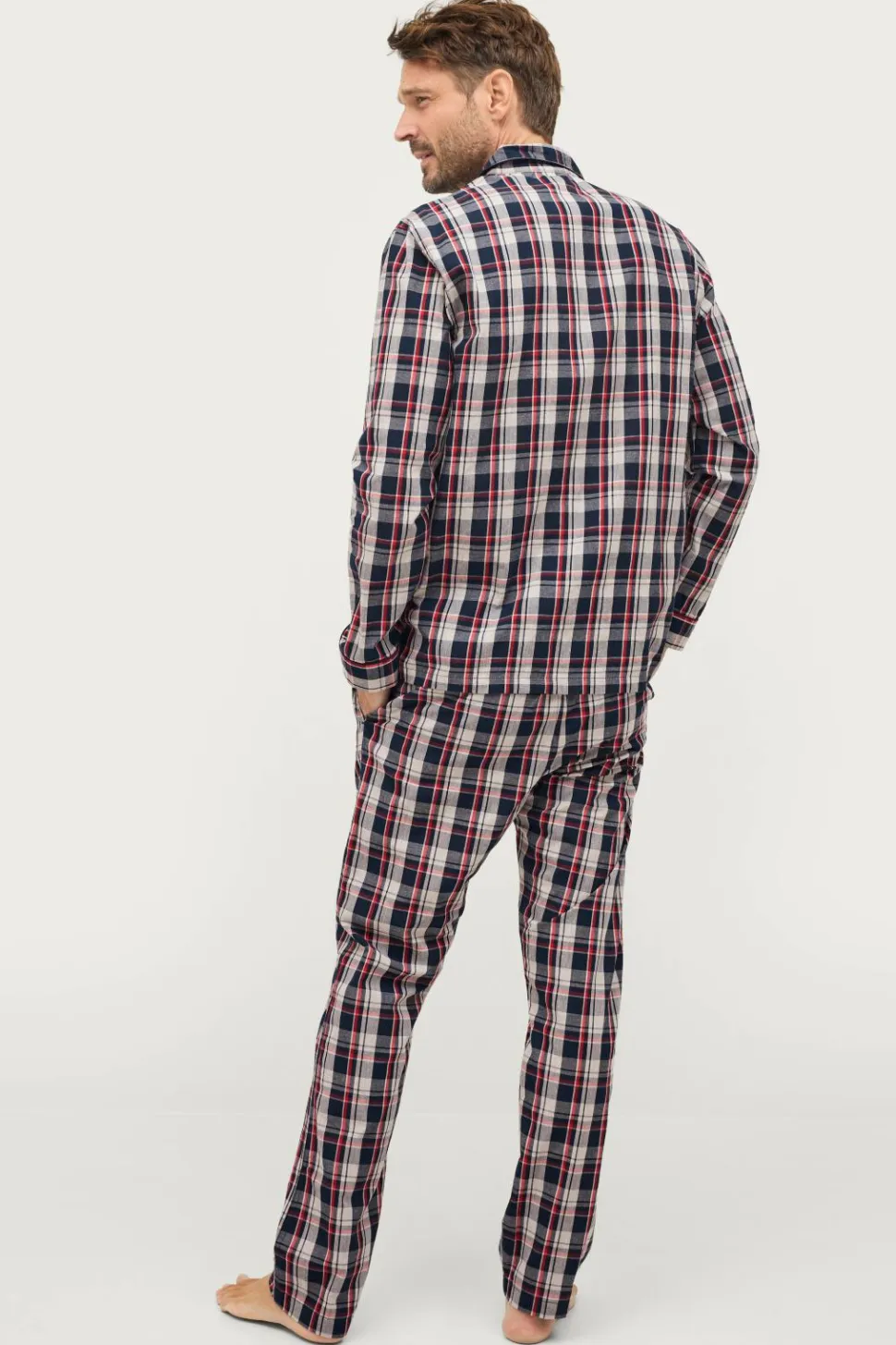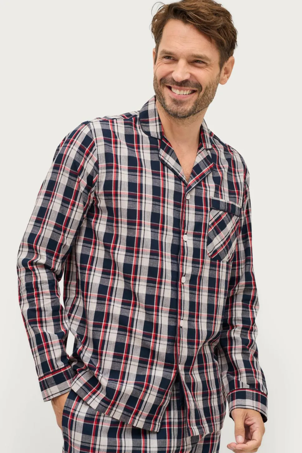 Todelt pyjamas i blød, vævet kvalitet med klassiske tern. Langærmet skjorte med krave og revers, knapper foran og en brystlomme. Bukserne har en elastisk talje med løbegang og lommer i siderne.