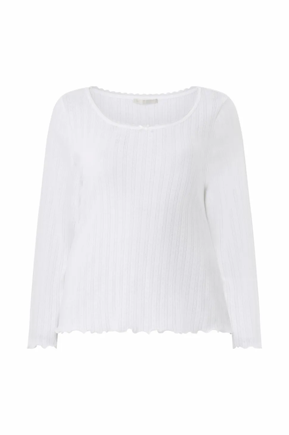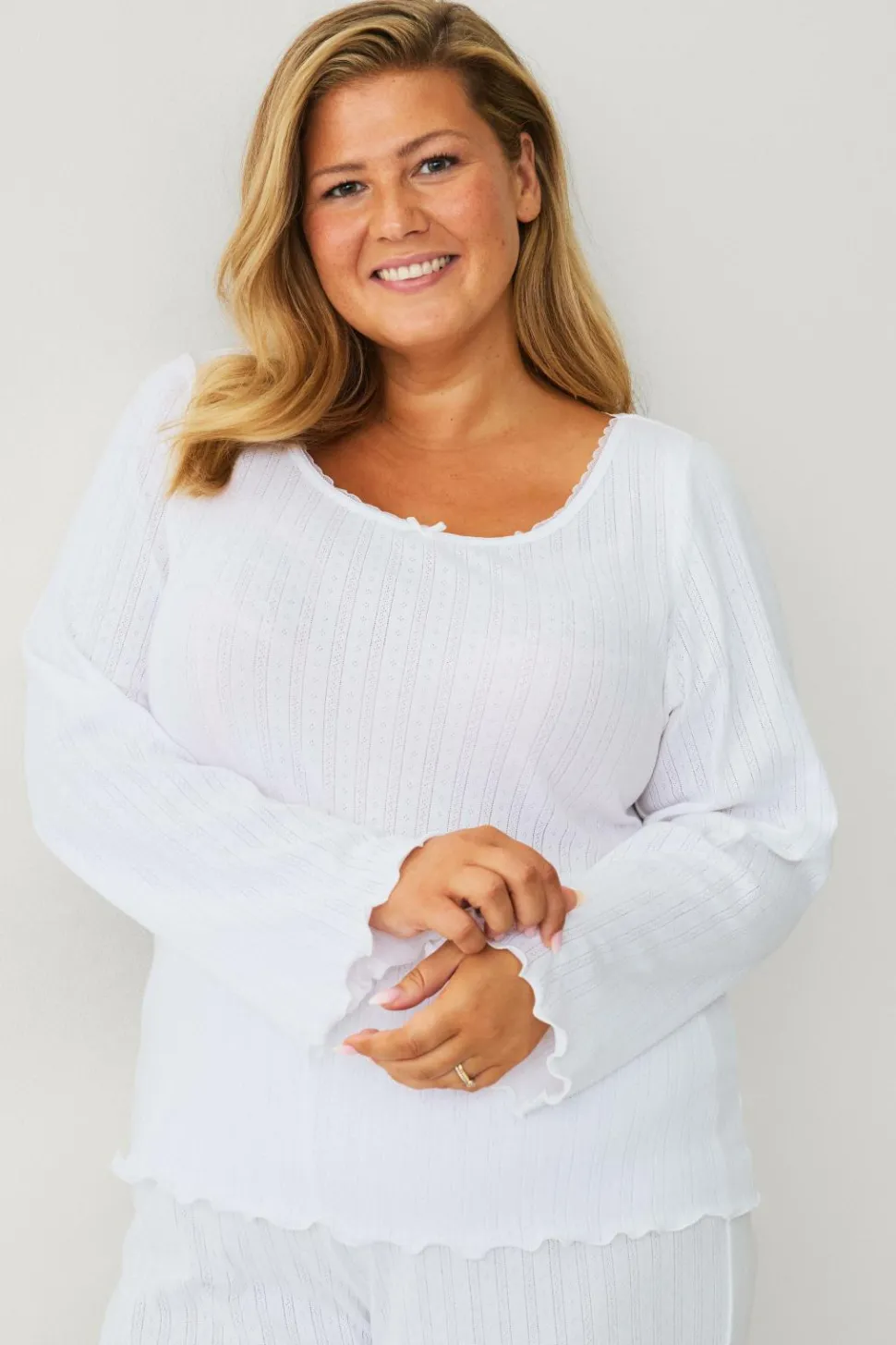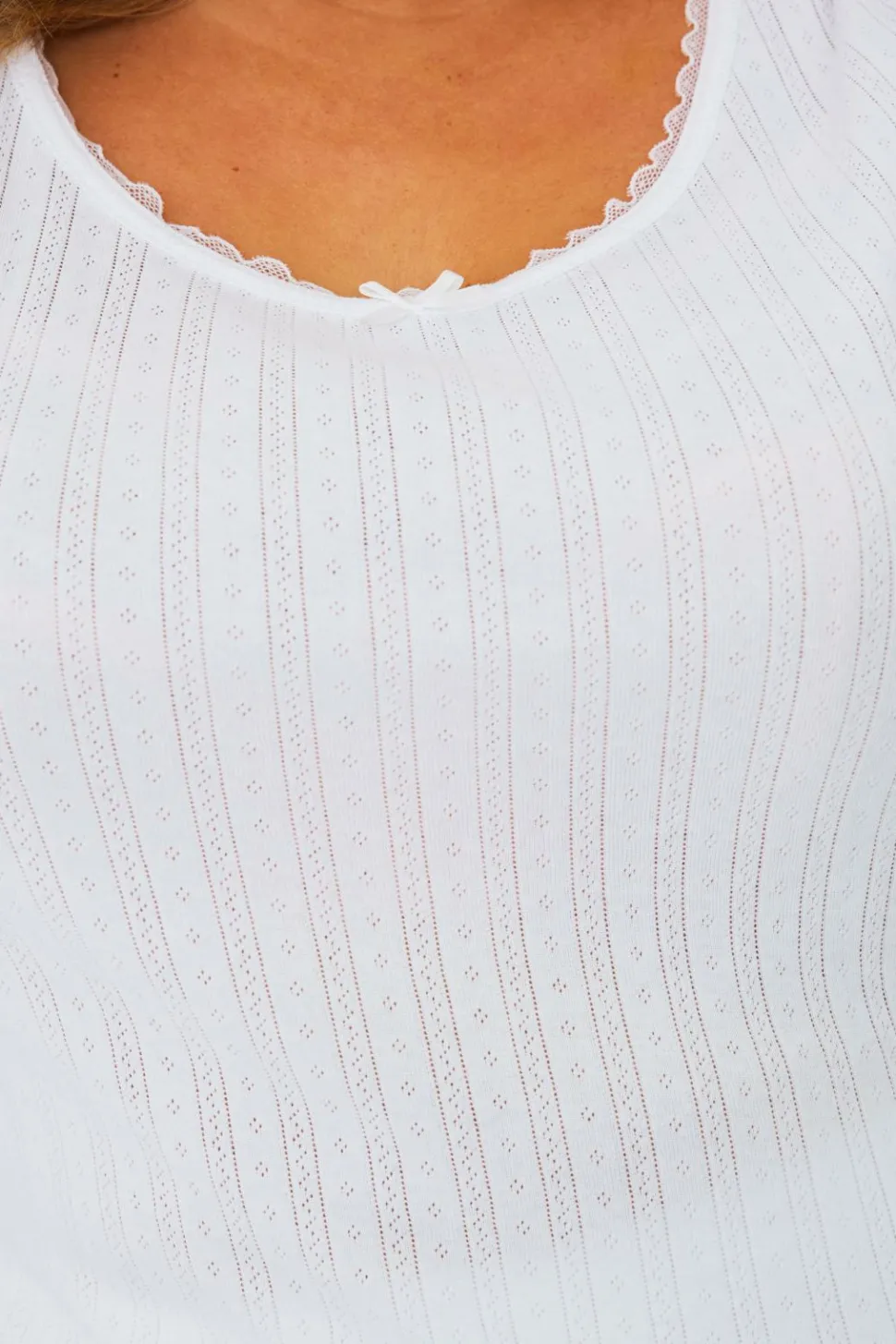 • Rund halsudskæring med dekorativ blondekant og en lille sløjfe